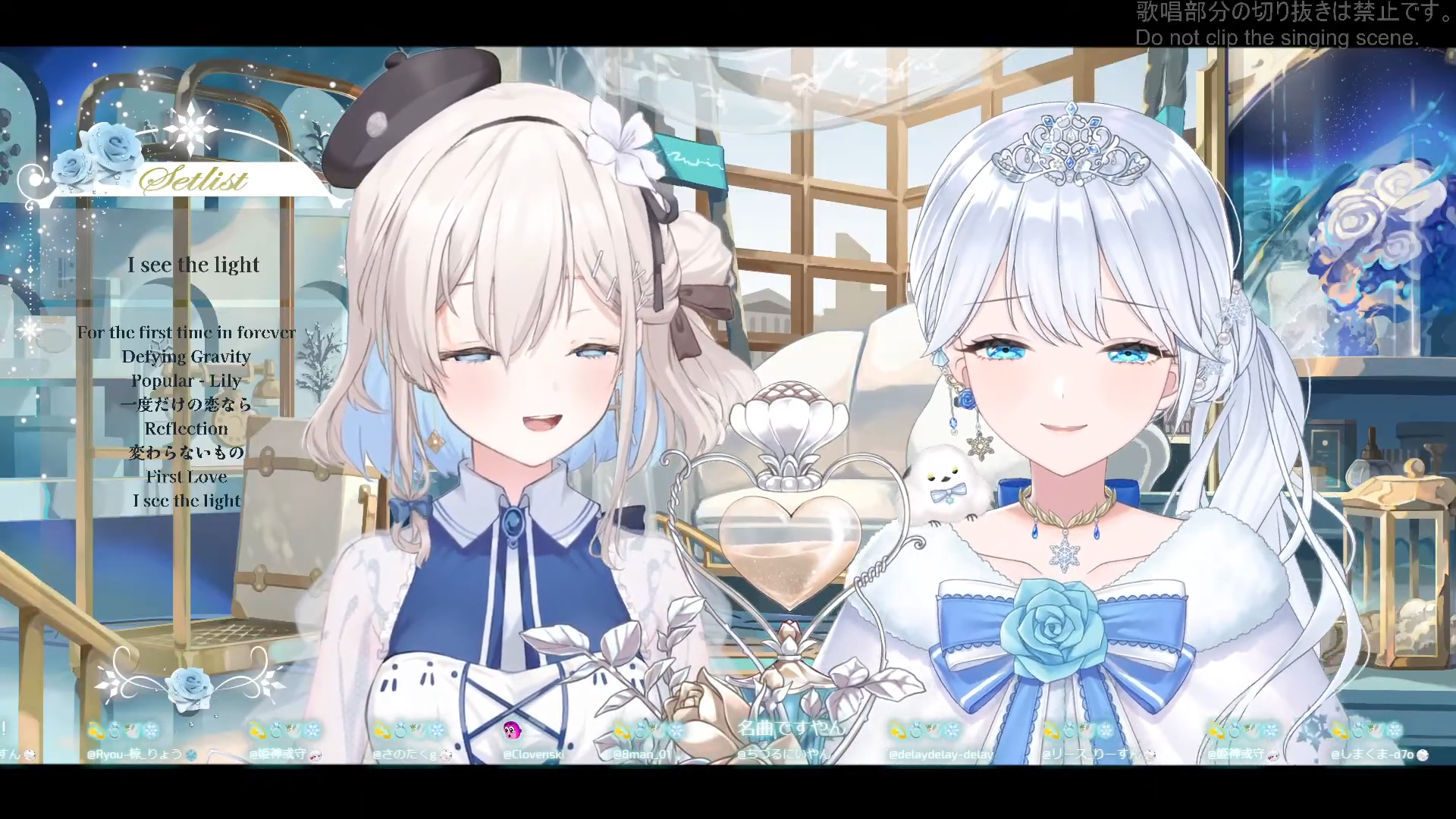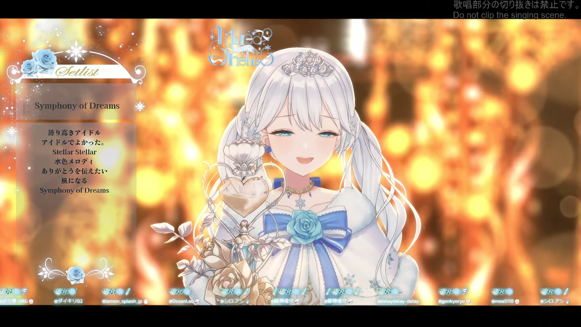 Song Frames and Special EventsYOSHIKAhttps://www.youtube.com/watch?v=600_mj5uI00Nemokumo Tsukuri shortshttps://www.youtube.com/watch?v=HY-7YJHjFnwSakusu Mayo Sax Session Streamhttps://www.youtube.com/watch?v=TwlfOT8gLXcIwasaki Kaho Flutehttps://www.youtube.com/watch?v=KtDrH5reNrATokiwa Aino 222 ccv endurancehttps://www.youtube.com/watch?v=BplGRbGP09MKyokahttps://www.youtube.com/watch?v=QgS9riQsAZ4Himemiya Reinya 120 likes enduance with New Costume Design Revealhttps://www.youtube.com/watch?v=J_btDQYUraEOhga Rukihttps://www.youtube.com/watch?v=eDzKVe4pnO0Lemo (just ended but sounds really solid)https://www.youtube.com/watch?v=btcUbK8Ynsw
