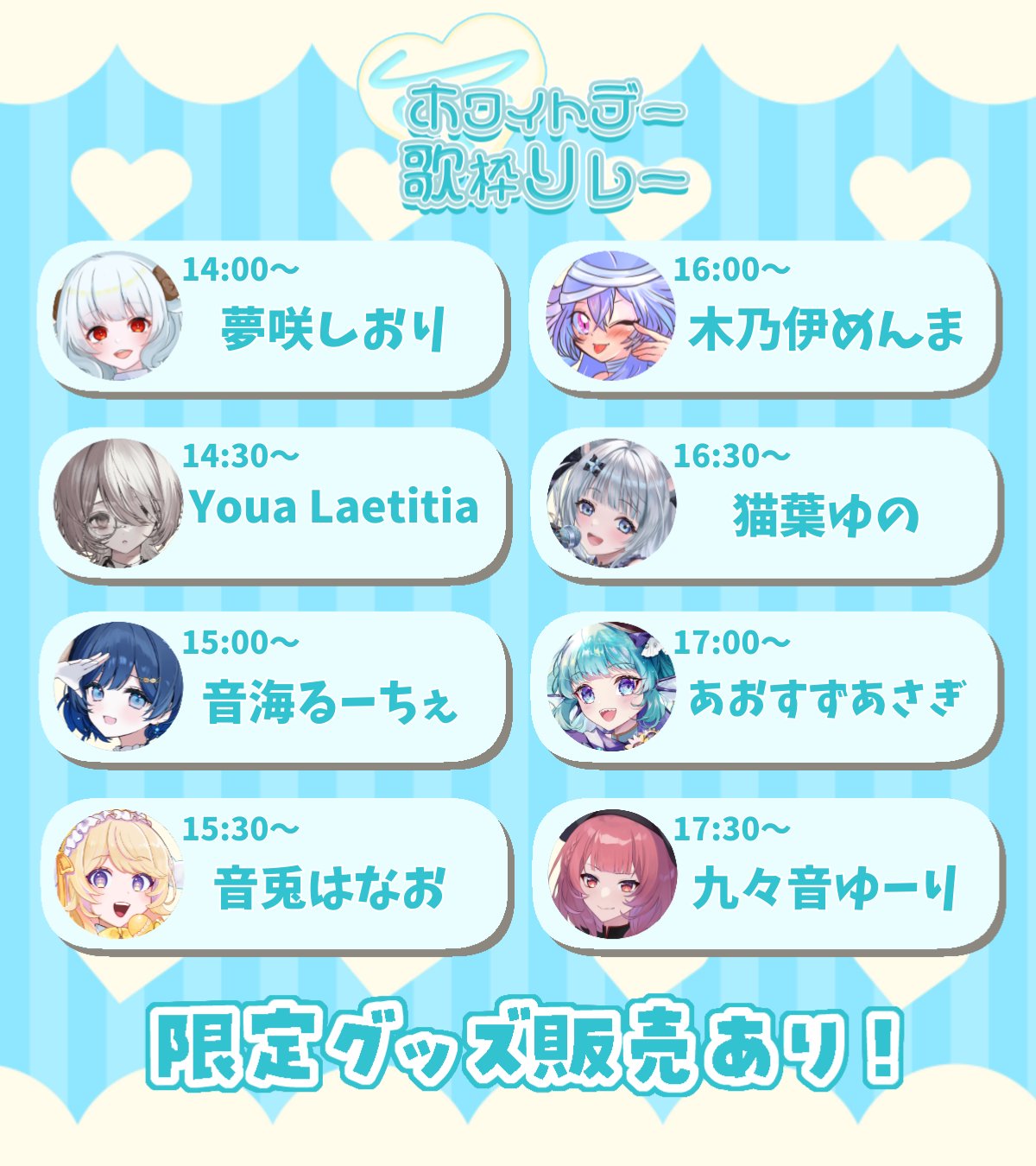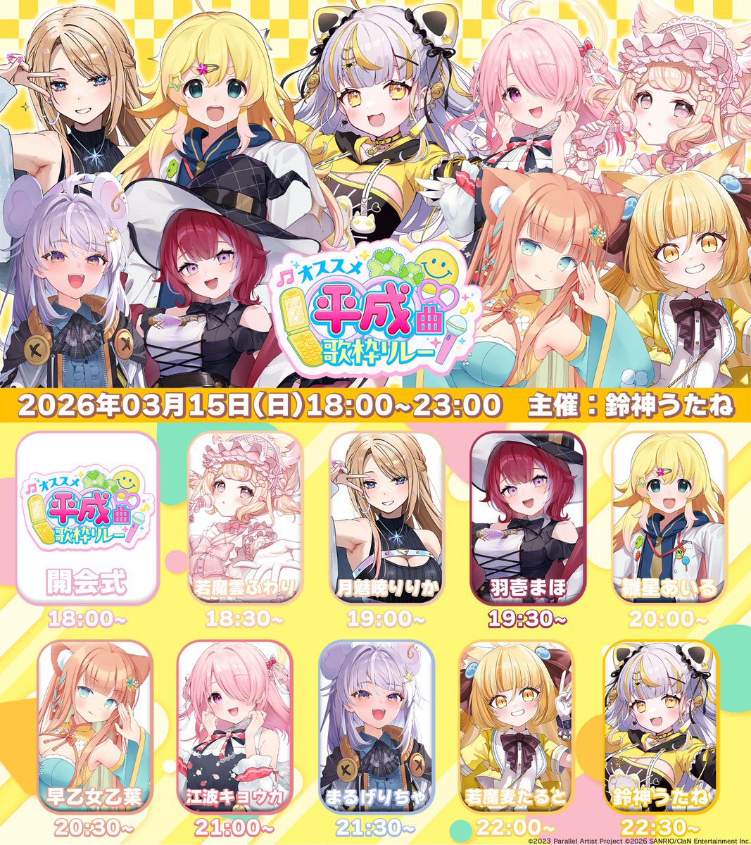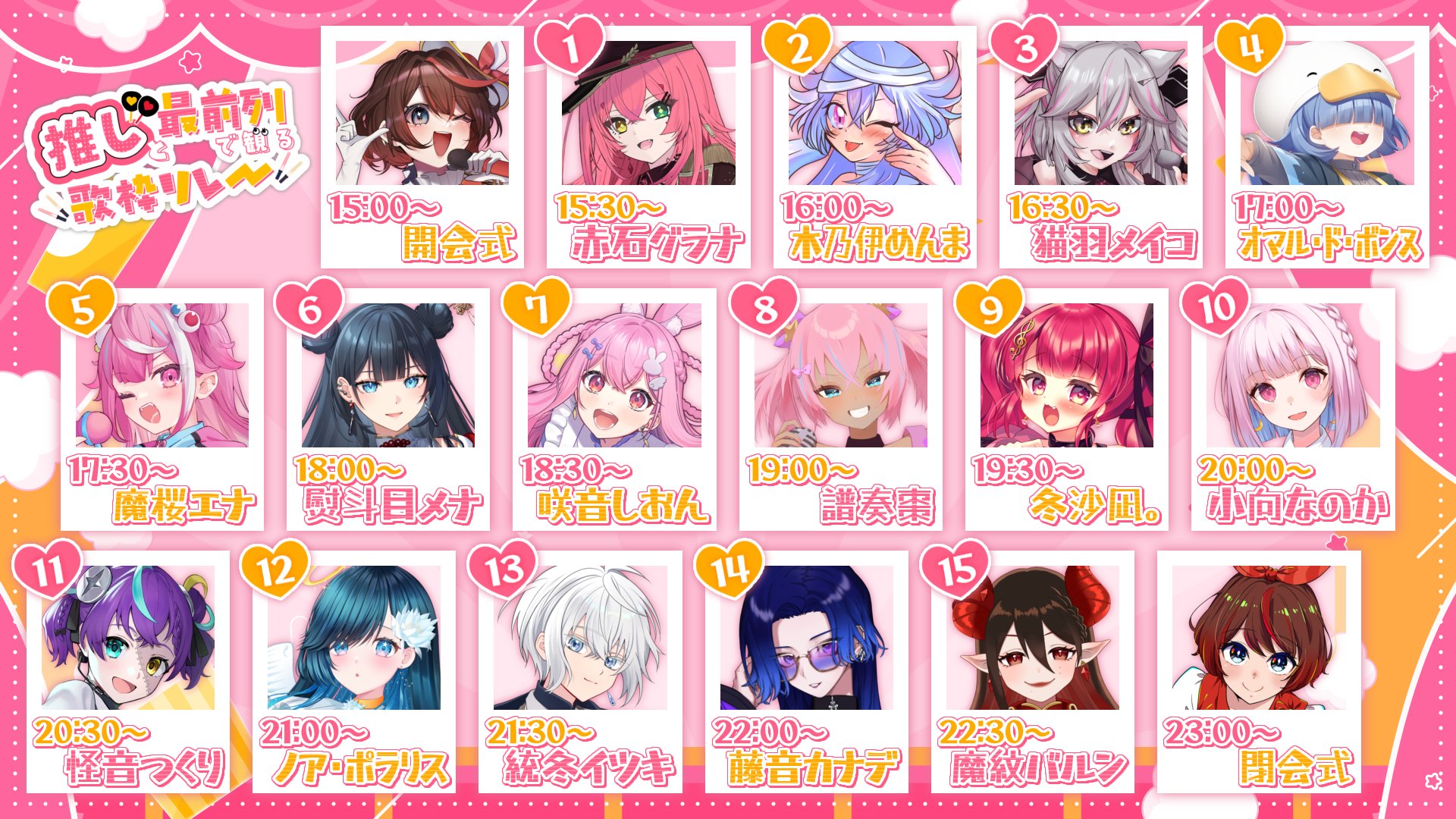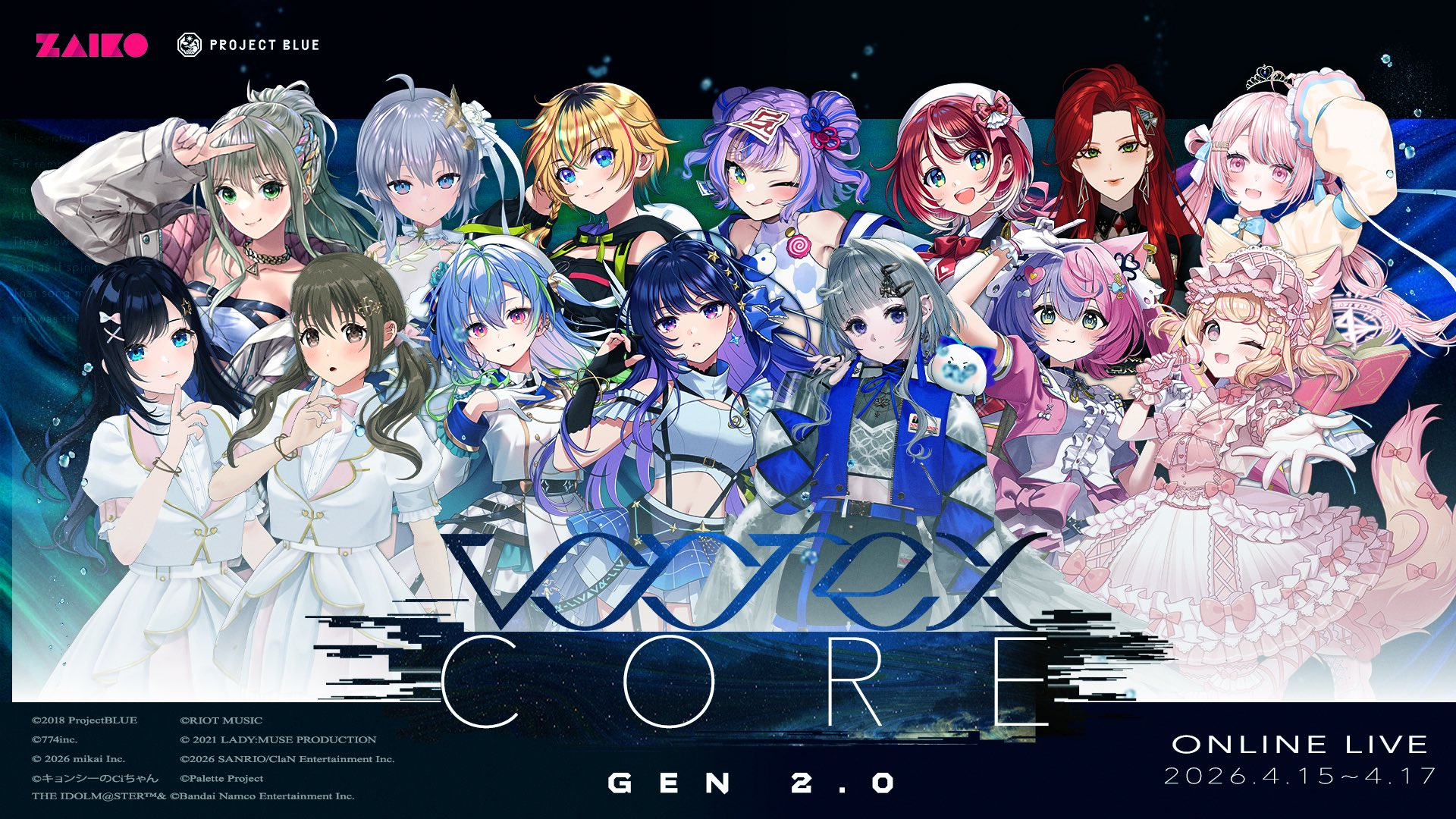 >>1101641904/15: vortex CORE -Gen 2.0- Day 1 (Iori, Letora, Femme Fatale, Anzu x Fuwari [Nyantashia!], OA: Yumeno) https://pjblue.zaiko.io/e/vortexgen2jp4/16: vortex CORE -Gen 2.0- Day 2 (Suu, Lir.E, Nemo, Cosmo, OA: Yumeno) https://pjblue.zaiko.io/e/vortexgen2jp4/17: vortex CORE -Gen 2.0- Day 3 (Ci-chan, Manaka, Route Heat [Rona & Konoha], and more!!, OA: Yumeno) https://pjblue.zaiko.io/e/vortexgen2jp