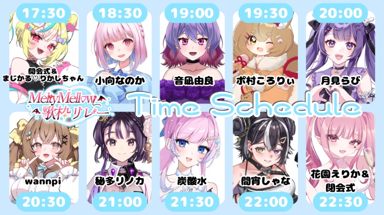 Song Frames and Special EventsAYAKAKI off-collab chat and karaoke partyhttps://www.youtube.com/watch?v=Sjizxmscn1UShishigami Leona guerrilla shorts for an hourhttps://www.youtube.com/watch?v=P4h9N663lbwUmitsuki Shellhttps://www.youtube.com/watch?v=rKRDK8S30mU