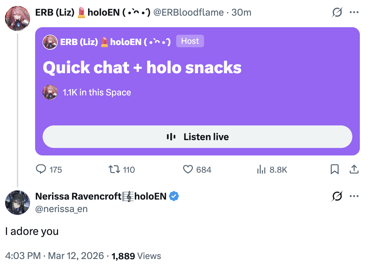 For the 889th time, what is Ope?!https://www.youtube.com/watch?v=qb_-taYLRfYAlso ENTER the Demon of Sound and Lover of Idols, Nerissa Ravencroft from Hololive EN Advent.>Streams▼ Upcoming streamsInto the Shadows | The Legend of Zelda: Ocarina of Time [P.3] | https://www.youtube.com/watch?v=tiQzLGk8kKg3/14 2000 CST | Fortnite▼ Previous appearancesHolofes Stage 4 | https://www.youtube.com/watch?v=mCgAcTJyvts | https://gofile.io/d/26rPIEMio's Day 2 Post Concert Stream | https://www.youtube.com/watch?v=H5K3J6eQTDI&t=1531Miko's Birthday Totsu | https://www.youtube.com/watch?v=N1RDB0KRvIM&t=7000▼ Previous streamsBIG NEWS! + Answering YOUR questions! | Fan Q&A | https://www.youtube.com/watch?v=Co_SBrM-oK0Back at it again! | PowerWash Simulator 2 | https://www.youtube.com/watch?v=wplj45omQY8Ope! It's EXPO week! | Members-Only | https://www.youtube.com/watch?v=ccPhJehepsc>MusicPlaylist | https://www.youtube.com/watch?v=YDyrIDHAdDY&list=PLSJG6WXf5JvFn2FWv_B5HP7DklUtdeZiMArchive of the struck down Moka - Lilium coverhttps://archive.ragtag.moe/watch?v=-GUdYPelG8cUnarchived karaoke (Feb 2025)https://archives.alwayswait.ing/hololive/nerissaravencroft/2025-02-15T00%3A55Z/Songs & Karaokes rentryhttps://rentry.org/karaokes_songs_v01>Recent Voice Packs>hololive Academy Vol 5: ~Dreamy Days in Spring & Summer Arc~https://www.youtube.com/watch?v=VaHDzZpTXp0https://shop.hololivepro.com/en/products/hololiveacademyvoice_dreamydaysinspringandsummerarc>Advent VS Justice Chapter 1.5 Voice Drama: Before the Stormhttps://shop.hololivepro.com/en/products/hololiveen_adventvsjustice_beforethestorm>hololive Valentine's Voice Pack 2026https://shop.hololivepro.com/en/products/hololive_valentinevoice2026>Recent Merch:>OTAKU https://otaku.shop/collections/hololive>Misty Mountain Gaming | Dice and shirtshttps://mistymountaingaming.com/collections/nerissa-ravencroft-x-mmg>GHOSTxGHOST https://ghostxghost.com/>hololive English Advent VS Justice Motion Comic Finale Commemorationhttps://shop.hololivepro.com/en/products/hololiveen_adventvsjustice_motioncomicfinalecommemoration>Useful LinksYouTube: https://www.youtube.com/@NerissaRavencroftTwitter: https://twitter.com/nerissa_enTikTok: https://www.tiktok.com/@nerissaravencroftArt tags: #RavenCrafts on Twitter (Lewds: #depravencrafts on Twitter); RavenCrafts, Nerissa Ravencroft or ネリッサ・レイヴンクロフト on pixivPrevious thread: >>110145747A word of advice: as per >>1 , be smart and don't reply or engage in off-topic or blatant bad faith arguments. To keep peace, hide and report.
