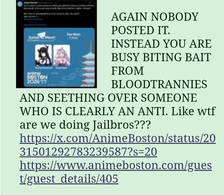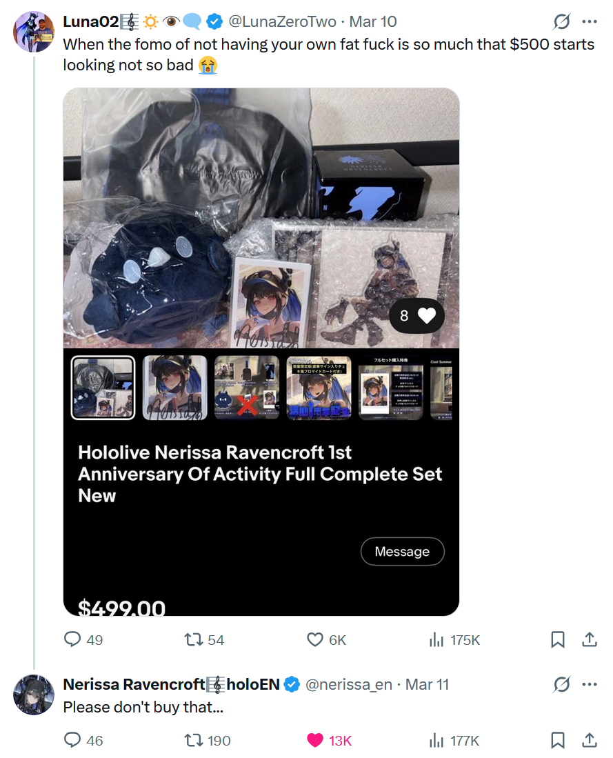 >>110187333>But there are generally a couple real jailbird posters that foam at the mouth when anything about ERB is posted and its what allows the shit ouroboros to continue.That's them replying to their own posts or eachother's posts. I am a BloodRaven disliker but i don't engage with their posts or post BloodRaven related tweets. I live post, comment on Rissa's tweets and share stories of her from other Holomem, most often FuwaMoco. I do admit that i am the numbers poster /here/ (both youtube and occationally spotify) most often using screenshots. Like I said, yesterday i was discussing the Advent jacket with someone and then suddentky there was a BloodRaven raid. But what they do comment on their own posts with hate and then everytime something happens they react like they have conquered their opponent>BLOODRAVEN WINS>BLOODRAVEN ANTIS BTFO'DBut they only won from their own hate post. The best example is the "dead ship" poster.