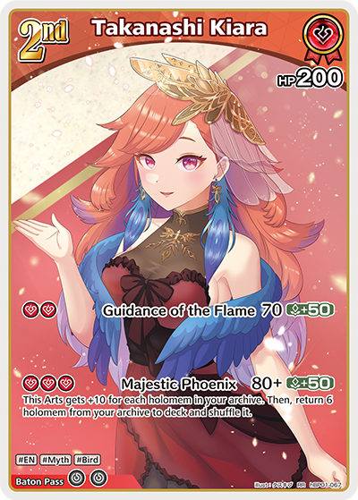 >>110216663>>110216695They recently gave her a new card that allows you to send 4 Kiara cards from your deck to the GY when you evolve her so her boss monster easily inflicting upwards of 200-220 damage consistently for 3 Mana without any buffs. (For reference, the average Holomember has up to 210 HP.) Since she has ways to fetch Holomembers from the GY rather easily, you can send pic related with the card I mentioned and next turn you fetch it back to your hand and evolve your Kiara again.