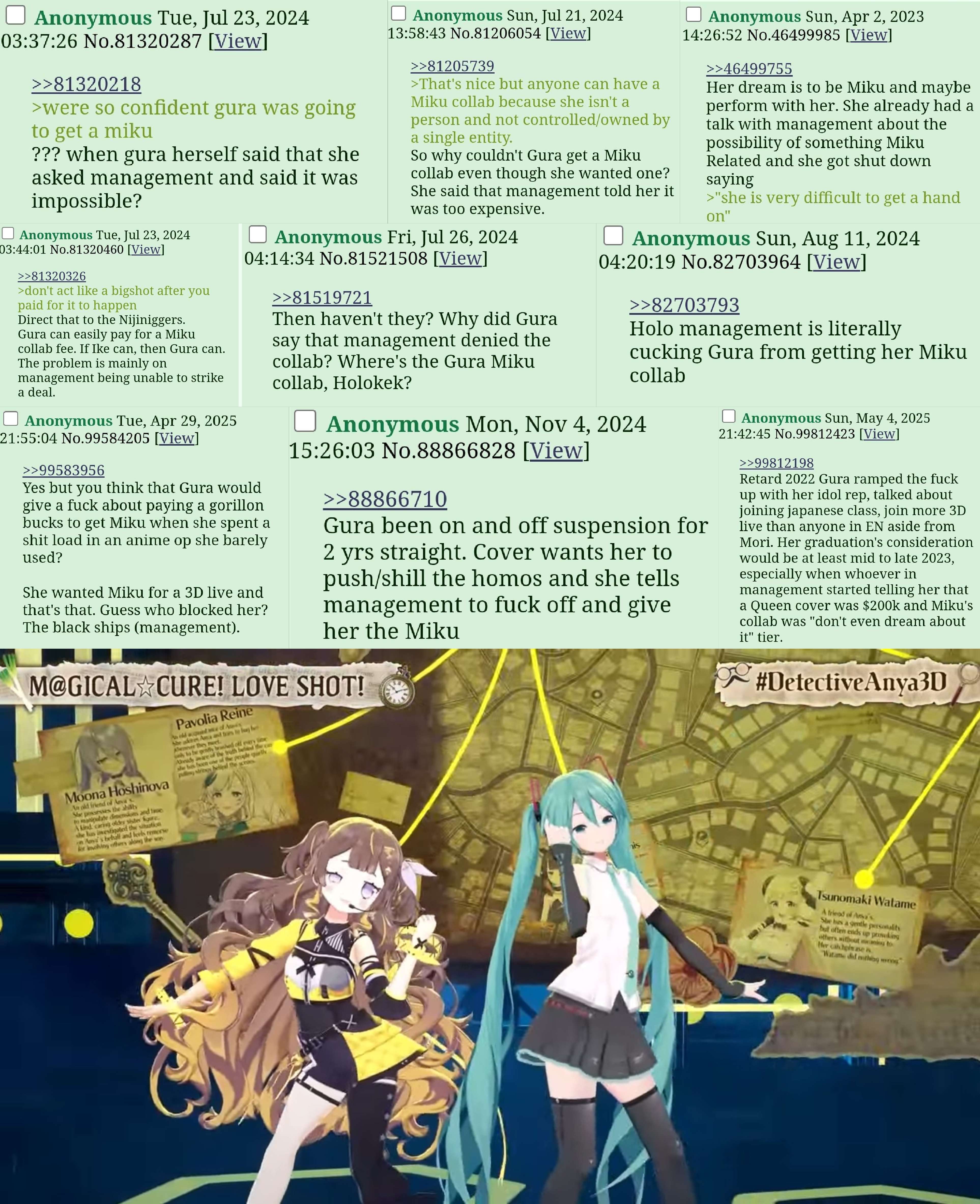 >>110181718Gura was on the management shit list it actually wouldn't be that much of a shock if Cover was throwing out bullshit when they told Gura that it wasn't possible to get her Miku for her 3D lives.