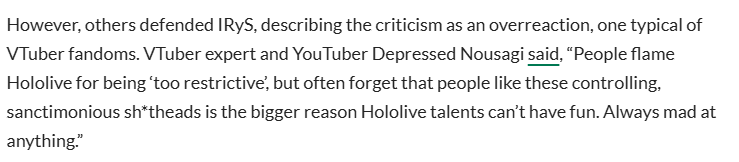 >>110184459>dexerto fags nijiniggers or did a nijinigger payed to these retards to cover this shit like why in the actual fuck are they doing an article for thisWhy did they call the flipgrifter a vtuber expert?>However, others defended IRyS, describing the criticism as an overreaction, one typical of VTuber fandoms. VTuber expert and YouTuber Depressed Nousagisaid, “People flame Hololive for being ‘too restrictive’, but often forget that people like these controlling, sanctimonious sh*theads is the bigger reason Hololive talents can’t have fun. Always mad at anything.”