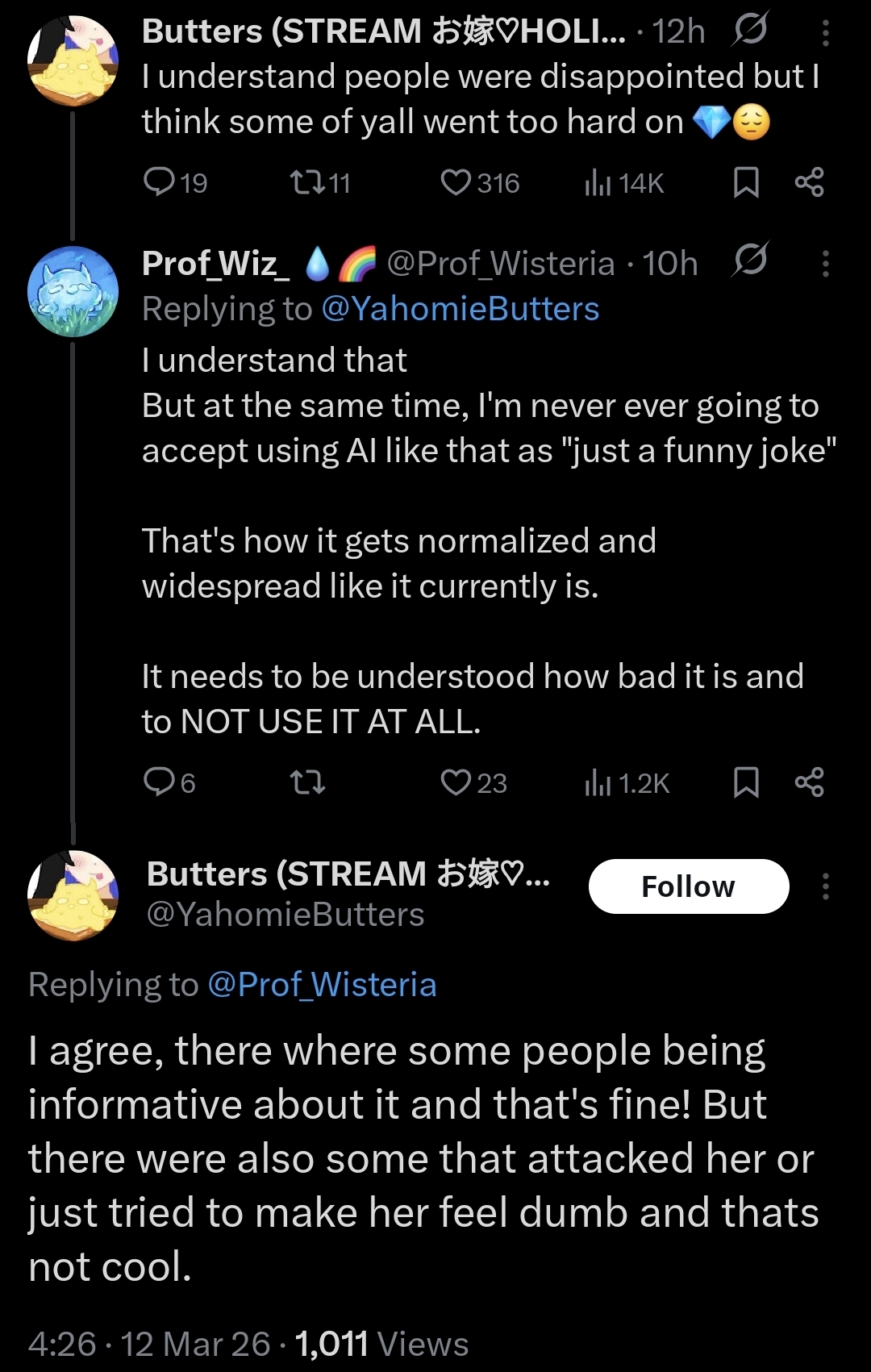 >>110184151>shit on HoloShe should keep her fucking fanbase in check and ensure the don't attack others like Nijitroons do. Like happened with Irys in the past 24 hours
