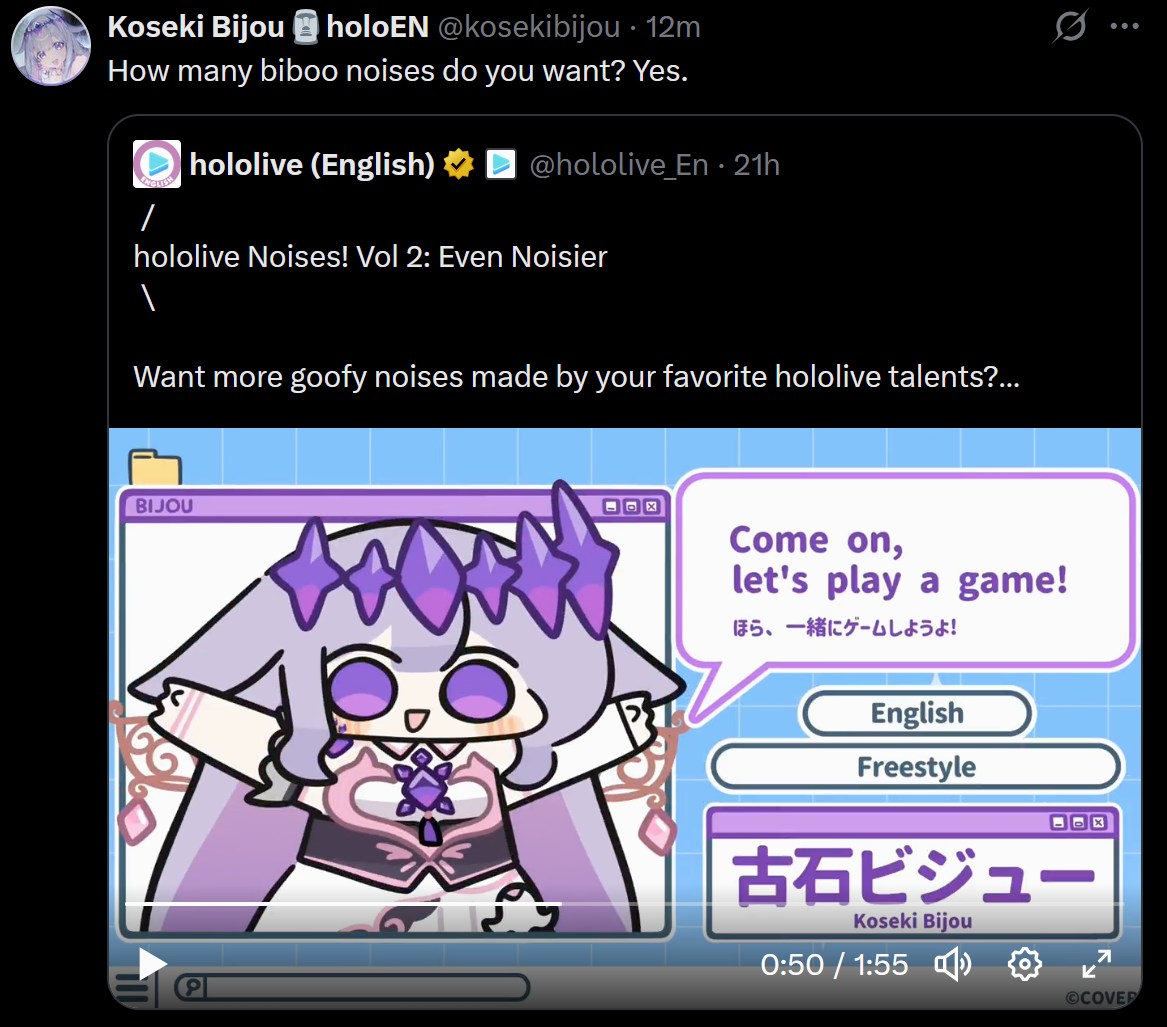 >LinksYouTube: https://www.youtube.com/@KosekiBijouTwitter: https://www.twitter.com/kosekibijouTikTok: https://www.tiktok.com/@kosekibijou1st orisong - Prism Magic: https://www.youtube.com/watch?v=M3pjFfKBonI2nd orisong - Rock In!: https://www.youtube.com/watch?v=XSZ0iMP80QQ>StreamsNext stream: https://www.youtube.com/watch?v=Z2q2FZ9OeGcPrevious stream: https://www.youtube.com/watch?v=IXfkzcDKK74Debut: https://www.youtube.com/watch?v=rpAQib0T5v03D Debut stream: https://www.youtube.com/watch?v=Yw0zL5YshRk>Shorts/music/unarchived streamshttps://rentry.org/e6mionzq>Merchhttps://rentry.org/tyfao78u>Intro/starter newpebble guidehttps://rentry.org/qpx5vnec>/gem/ OP template:https://rentry.org/vt_gem_opDo not engage with diggers (trolls, doxxers, holo vs holo baiters). Hide, report and rock on.>Previous>>110185901