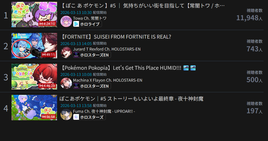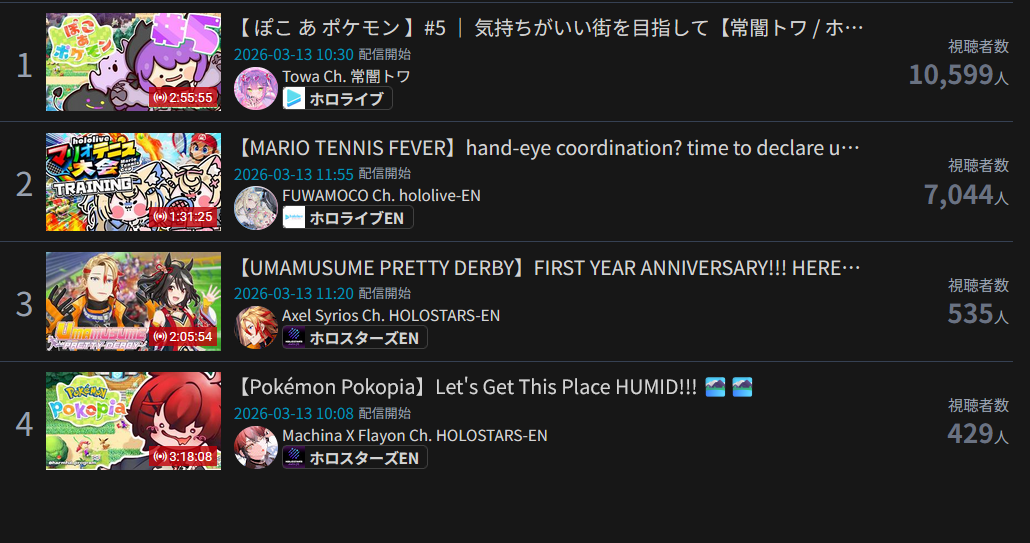 >>110201368MAR 2026 Floor tally>1) 10,110: Yashiro (nijisanji) niji air riders fes [24]>2) 10,126: Koyori (hololive) 無駄をそぎ落としすぎたRPG [19]>3) 10,116: Watame (hololive) Pokemon LEGENDS Z-A [21]>4) 10,053: Koyori (hololive) Pokemon Pokopia [15]>5) 10,019: Nerissa (hololive) Fan Q&A [14]>6) 10,409: Kiara (hololive) pre-concert KARAOKE [13]>7) 10,425: Su (hololive) zatsudan [18]>8) 10,813: Noel (hololive) EXPO stage watchalong [22]>9) 10,112: Moka (VSPO) VSPO SHOWDOWN SF6 practice [23]>10) 10,016: Lulu (nijisanji) Pokemon Pokopia [23]>11) 10,387: Riona (hololive) BLEACH Rebirth of Souls #7 [17]>12) 11,025: IRyS (hololive) Mario Tennis Fever [18]> PER COMPANY2x: nijisanji9x: hololive1x: VSPO> PER STREAMER1x: Yashiro, Koyori, Watame, Koyori, Nerissa, Kiara, Su, Noel, Moka, Lulu, Riona, IryS
