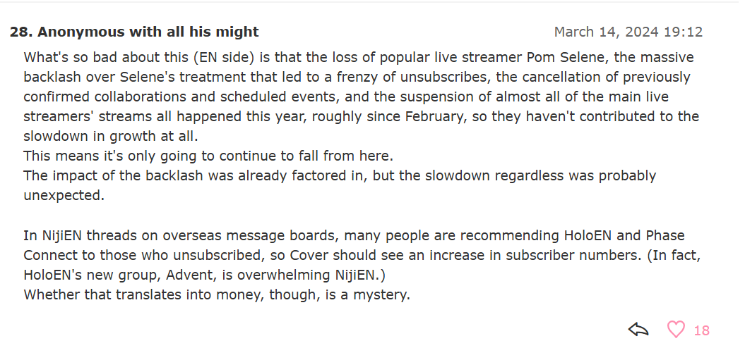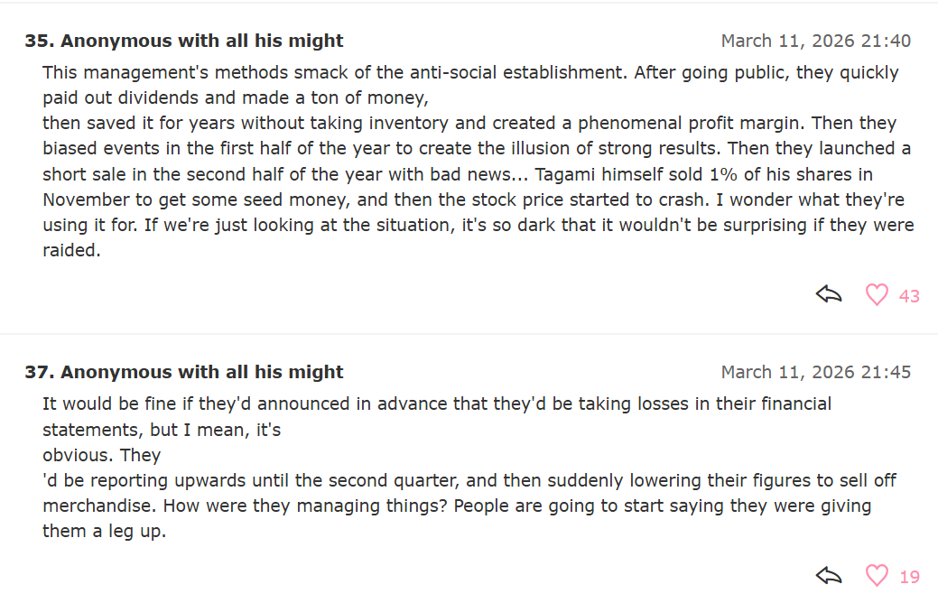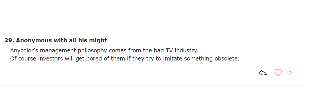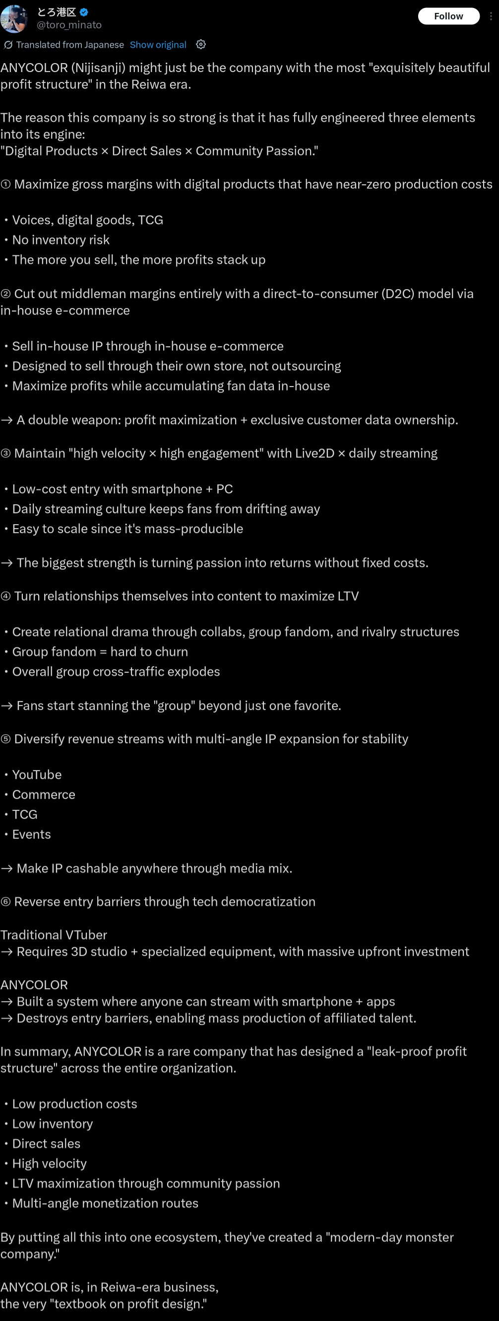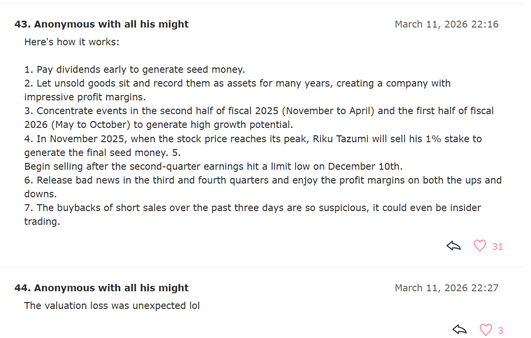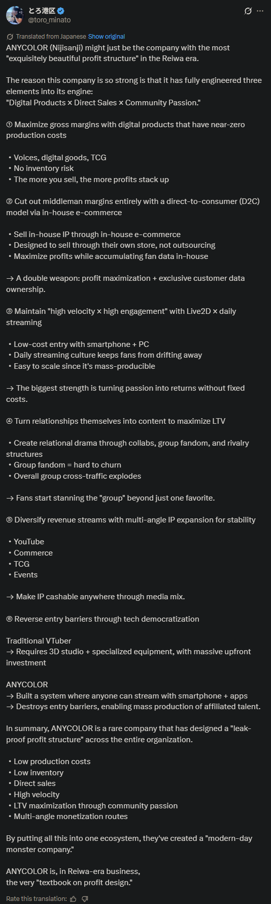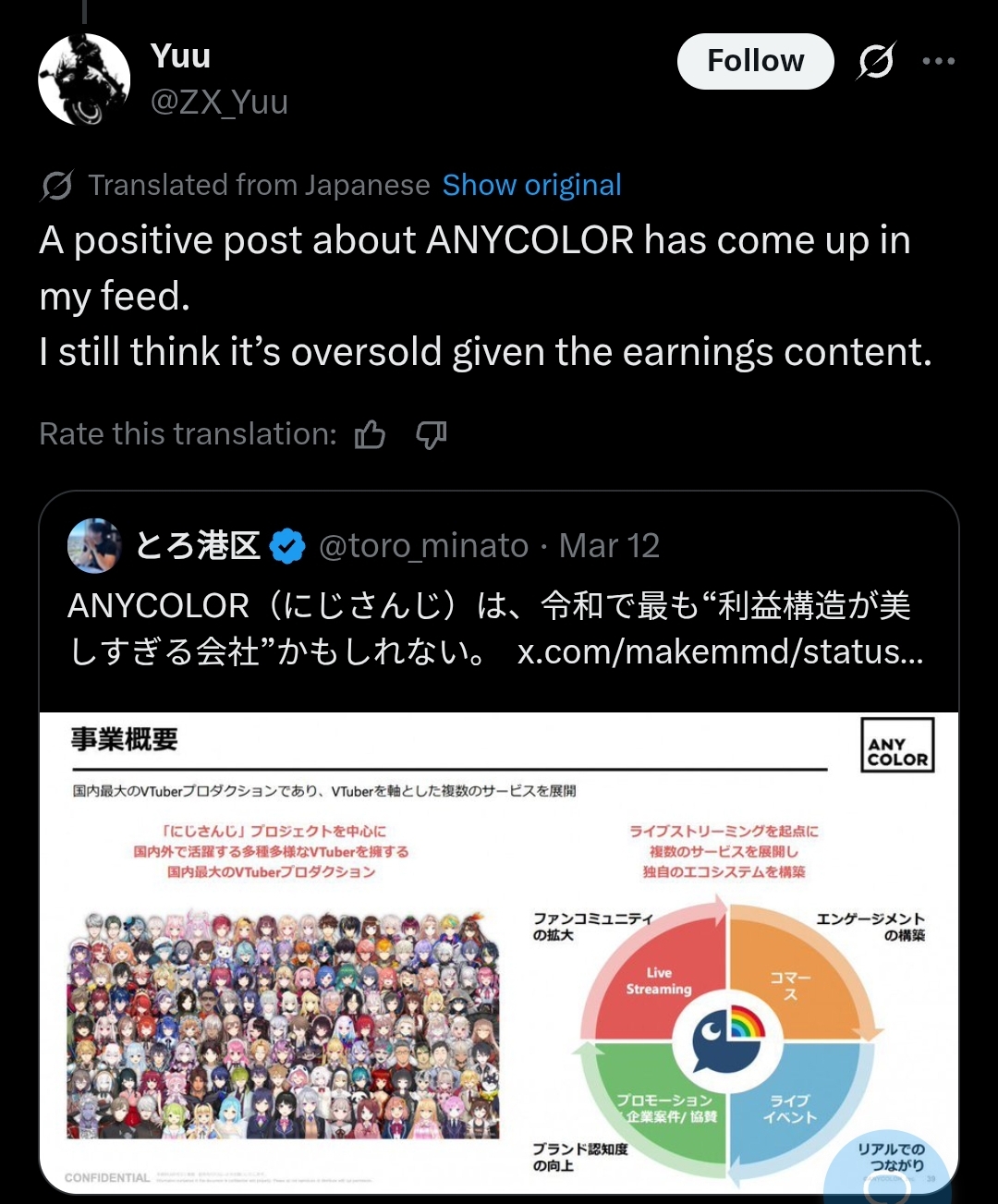 https://x.com/toro_minato/status/2031984844406997172>Anycolor IR>lots of praise, get called the most exquisitely beautiful profit structure of the new age>Cover IR>no dividends, low profit, poor investments in Holoearth all called outIs there even any contest