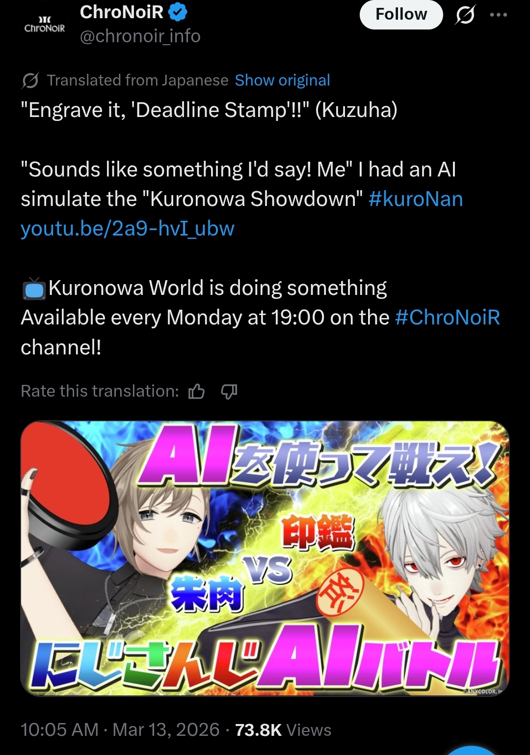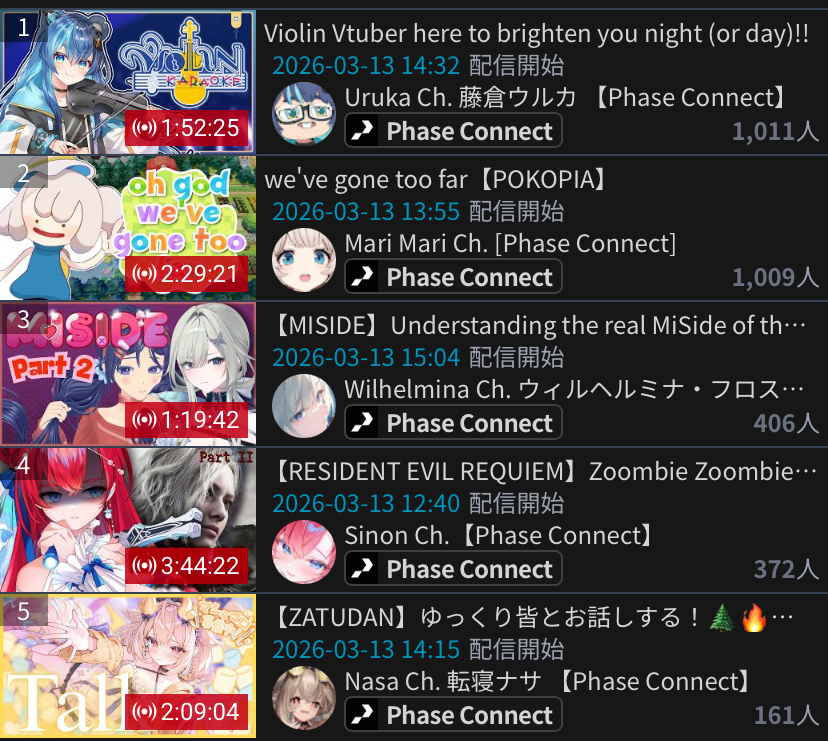 >>110201326MAR 2026 HIGHLANDER>1) 52,306: Akairo Mia (Brave Group) NEWTOWN clipshow>2) 81,490: Nene (hololive) 3D Live Birthday>3) 40,481: Miko (hololive) Biohazard requiem FINALE>4) 32,076: Subaru (hololive) Super Mario World #6 [S]>5) 30,989: Kuzuha (nijisanji) NijiZoff [S]>6) 64,838: Hololive (hololive) holofes STAGE free part>7) 39,839: Toya (nijisanji) 8th anniversary totsumachi [B]>8) 52,187: Pekora (hololive) Important Announcement [B]>9) 46,398: Elu (nijisanji) Niji Apex fes 2026 team & rules announcement>10) 45,512: Marine (hololive) Mario Tennis Cup>11) 20,944: Noel (hololive) Mario Tennis Fever [5th]>12) 45,192: Okayu (hololive) Mario Tennis totsumachi> PER COMPANY1x: Brave Group8x: hololive3x: nijisanji