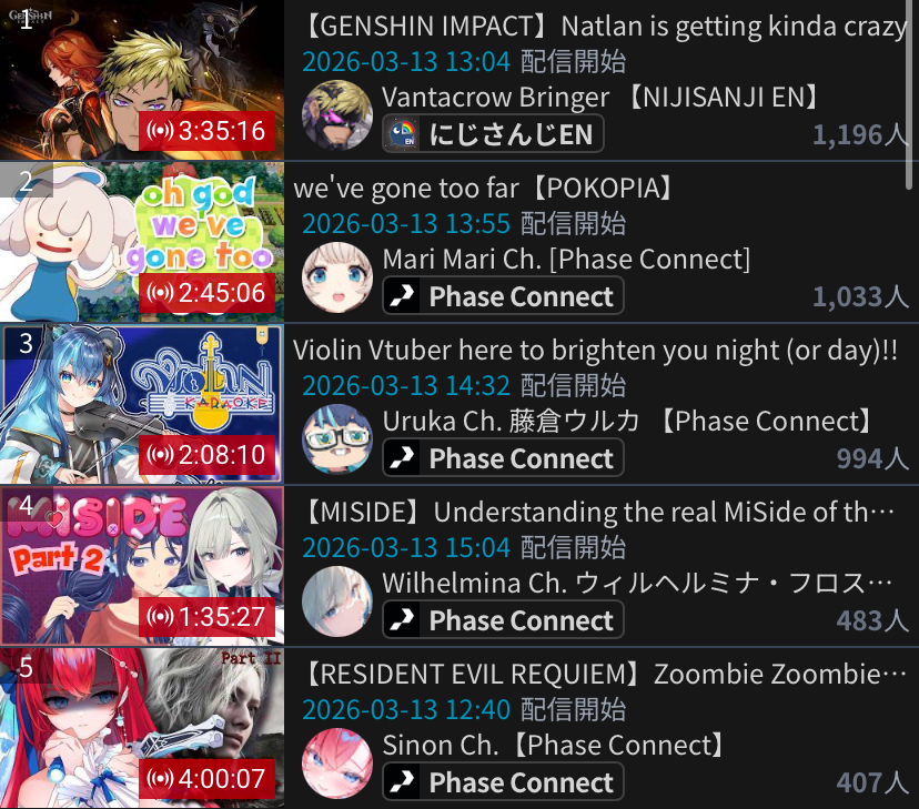 >>110201235*GENERAL NUMBERFAG SITES*>https://playboard.co/en/>http://ikioi-ranking.com/>https://vrabi.net/>https://www.vstats.jp>https://live-ranking.userlocal.jp/vtuber-ranking>https://vt.poi.cat/Hololive sites>https://www.hololyzer.net/youtube/index.html>https://trackholo.live/en/>https://holo-spotify-stats.jirikunes.eu/Twitch sites>https://sullygnome.com/>https://twitchtracker.com/>https://stats.roki.sh/>https://streamscharts.com/