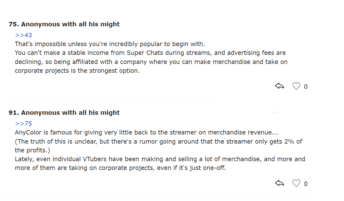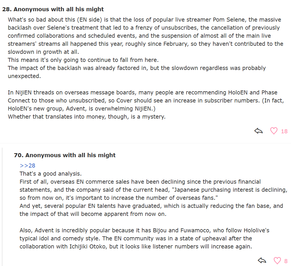 >>110201486>Whether that translates into money, though, is a mystery.Advent makes more money in a single merch release than all of niji en does for an entire year. The only thing niji en has going for it at this point is the handful of whales that superchat to scarle, aia, and for some reason miload still. Basically the same situation as homostars where they have a very small group of people that superchat but can't afford/don't want merch.