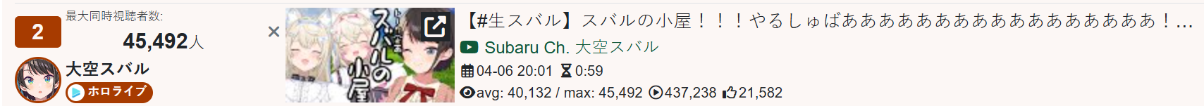 >>110201290MAR 2026 SILVER>1) 50,543: Nijisanji (nijisanji) Niji air riders fes>2) 39,195: Miko (hololive) BIOHAZARD requiem #3>3) 40,125: Miko (hololive) SoraMiko collab>4) 32,076: Subaru (hololive) Super Mario World #6>5) 30,989: Kuzuha (nijisanji) NijiZoff>6) 37,404: Hololive (hololive) holofes day1>7) 53,057: Hololive (hololive) holofes STAGE2 DAY2 free part>8) 59,748: Hololive (hololive) holofes STAGE4 DAY3 free part>9) 27,779: Miko (hololive) Pokemon FireRed>10) 35,457: Subaru (hololive) Mario Tennis Fever w/ Okayu>11) 29,892: Kuzuha (nijisanji) APEX>12) 32,136: Anya (hololive) 3D BIRTHDAY LIVE> PER COMPANY3x: nijisanji9x: hololive> PER STREAMER3x: Hololive, Miko2x: Subaru, Kuzuha1x: Nijisanji, Anya