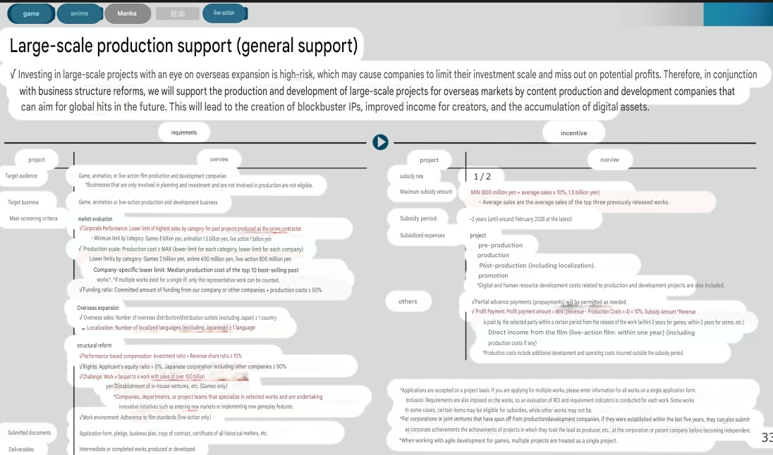 https://www.meti.go.jp/policy/mono_info_service/contents/PDF/260310/ip360.pdfhttps://www.meti.go.jp/policy/mono_info_service/contents/PDF/260310/ip360.pdfJapan's Ministry of Economy, Trade, and Industry is initiating a large scale subsidy and assistance program specifically for overseas expansion to achieve its target of 20 trillion content export by 2033. This initiative includes 9 classes of subsidies and will start in late March this year.Cover Corp is uniquely positioned to be able to receive benefits from at least 7 of these 9 subsidies which ranges from IP protection assistance, localization, promotion, to Next Generation technology and platform like Metaverse and Mixed Reality.Pic related is one of such subsidy that focuses on general traditional content such as Games, Anime, and Live Action production with grants up to $10M USD per project.Thoughts?
