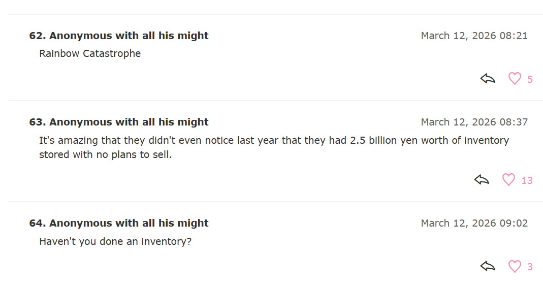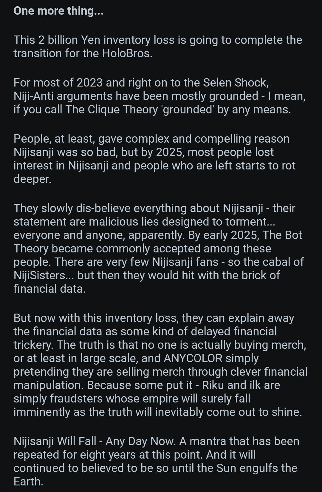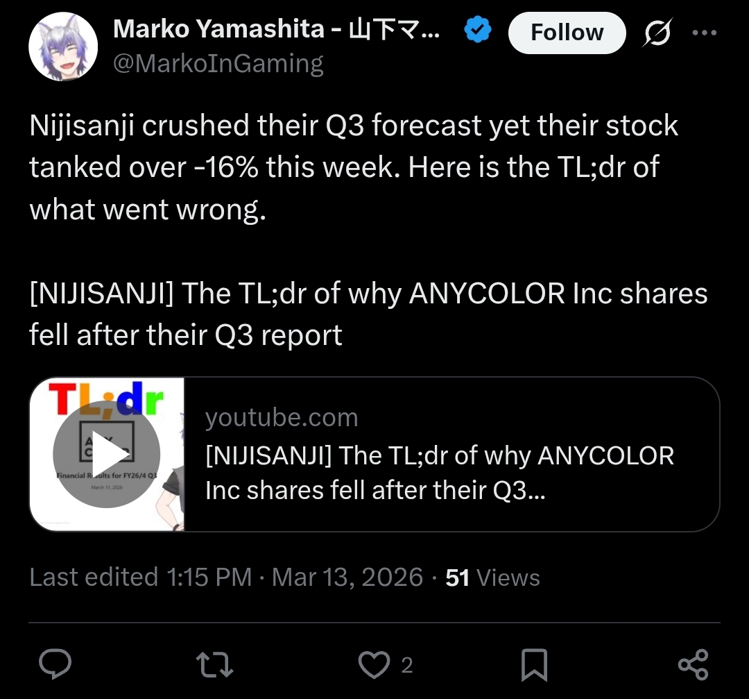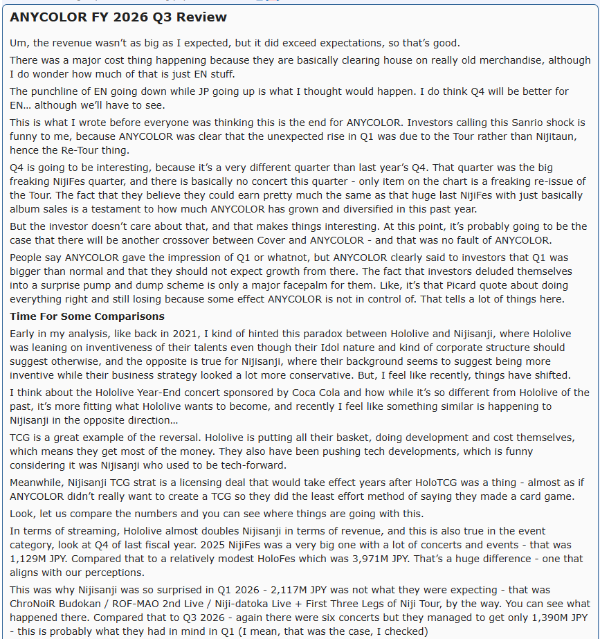 >>110208865I feel like he invested all his chips into anycolor and is now coping with hopes that they will grow.He doesn't realize this that with inventory loss and this will continue in Q4. Their stock is gonna go down again unless they have really big announcements during niji fes that rival holo. Another thing is everytime they do buyback with hope of financial institution eat up their stock again they have to use up their own money which they were planing on using for their livers project. So more they do buybacks more they fall behind which in turn leads to other corpos jumping over them and running ahead Also I might have to do a comparative analysis between anycolor and cover balance sheet. It might reveal something that this retard is missing out on