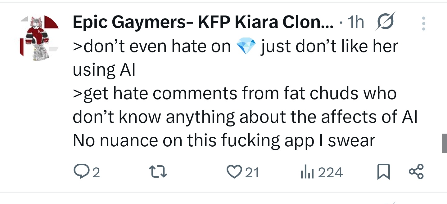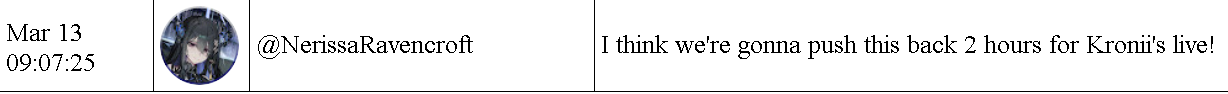 The thing about Nerissa's overlap is she doesn't stream for 1-2 weeks and then decides she needs to stream for 5 hours directly over an EN 3D Live. This is about her 5th time doing this now.Kiara coming in to leech off the funnel is just typical numberfag desperation.