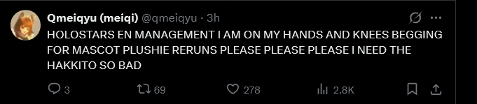 >>110206440> Merchandise is the moneymaker for both Hololive and Nijisanji and Nijisanji regularly doubles Hololive in terms of merch. Why? Well, ask a Niji Fan and they will tell you Nijisanji tends to pump out merch like no other. Hololive simply does not have the capacity to pump out merch like Nijisanji does, and there is another factor - western fans simply buy fewer merch than JP fans. As one derogatorily puts it - “Japanese are great subhumans for buying cheap plastic miniatures made in China”, so Hololive has to make do with something more universal.I feel like if cover wanted to they could pump out the same amount if not more merch than niji Also this whole thing reads like pure cope