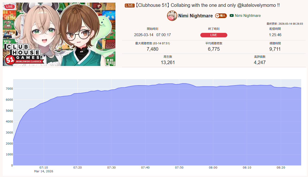>>110214639MAR 2026 EN SILVER3/1 - Nimi - Resident Evil Requiem: 8,2533/2 - Bijou - FNAF 2: 11,8093/3 - Raora - Return Zatsu: 8,7823/4 - Calliope - Resident Evil Requiem: 8,1023/5 - Nerissa - Announcement Collab: 10,0193/6 - Nimi - Resident Evil Requiem: 5,4913/7 - Only one talent qualified for the tally this day.3/8 - No talent qualified for the tally this day.3/9 - Nimi - Elden Ring Nightreign: 5,1453/10 - Nimi - Resident Evil Requiem: 6,2553/11 - Hololive English - Takotori Dance Lesson: 5,6583/12 - IRyS - Mario Tennis Fever: 11,0253/13 - Bijou - Future Games Show Watchalong: 10,042PER COMPANY7x: Hololive English4x: Indie2x: N/APER STREAMER4x: Nimi2x: Bijou1x: Raora, Calliope, Nerissa, IRyS, Hololive English