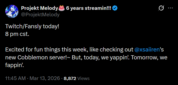 https://x.com/ProjektMelody/status/2032498262532669613Mel stream tonight at 8PM CST. She'll be yapping today and then fapping tomorrow. She'll also be in Saii's Cobblemon server so I'm looking forward to that.