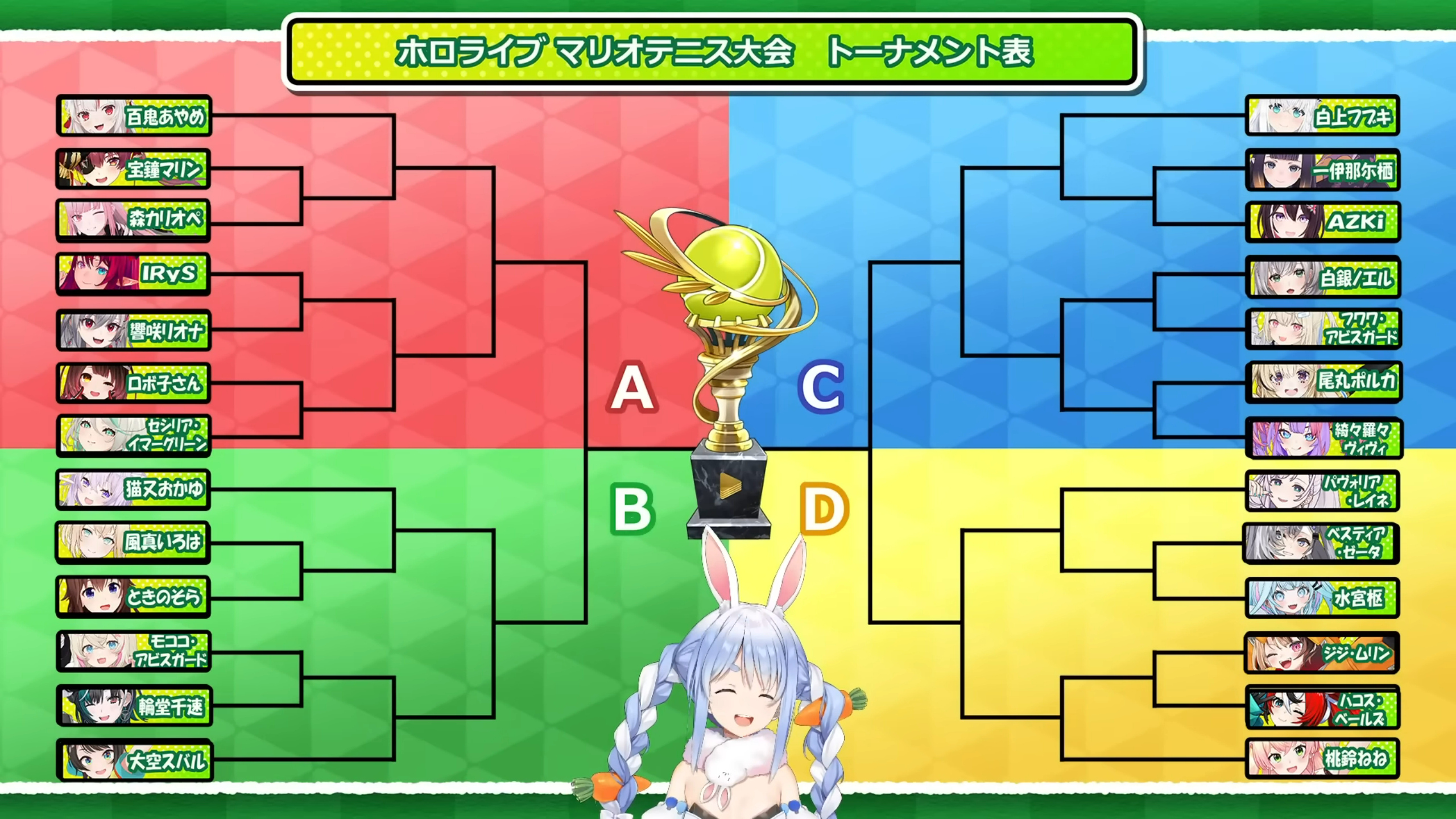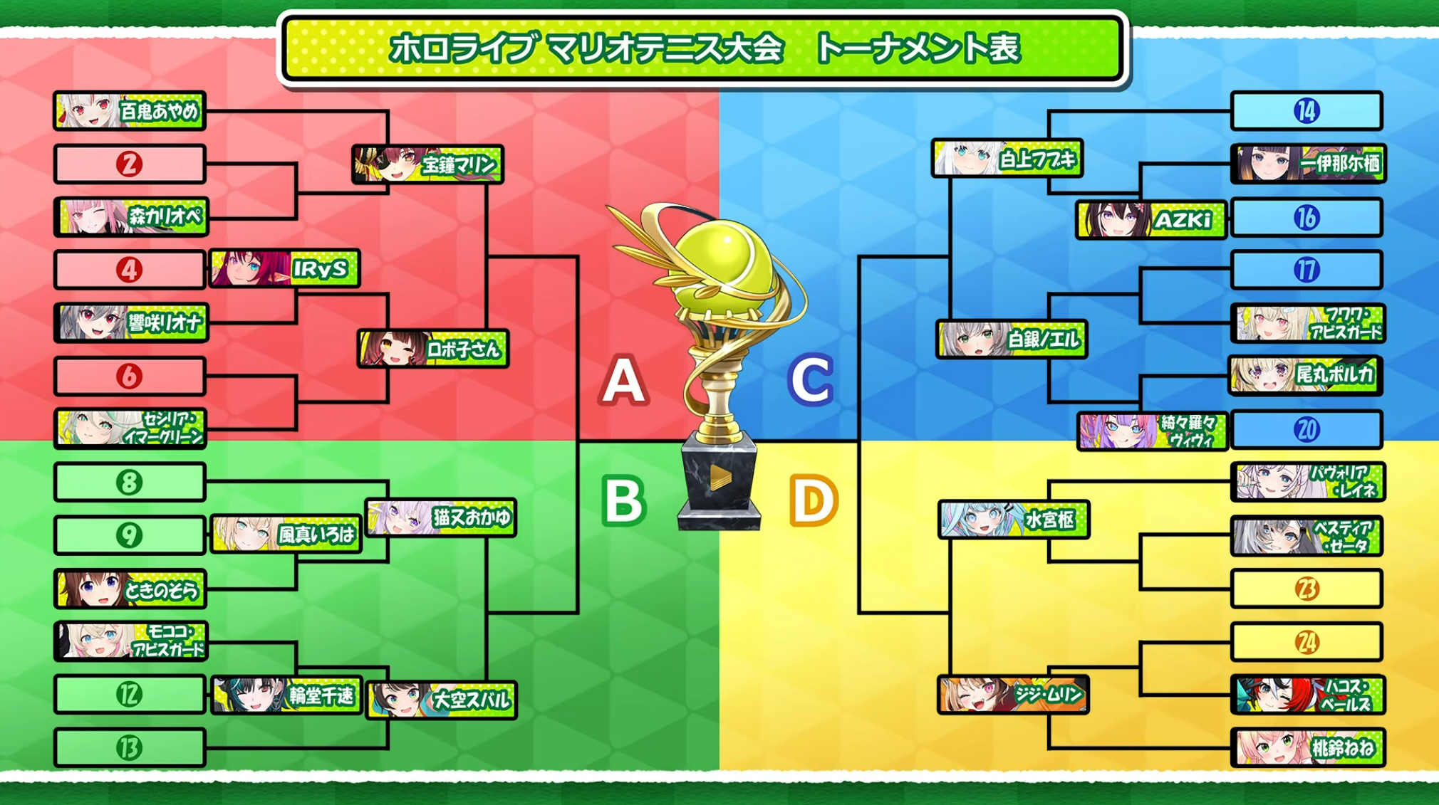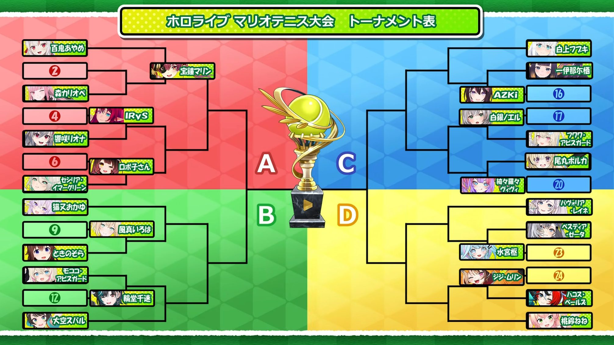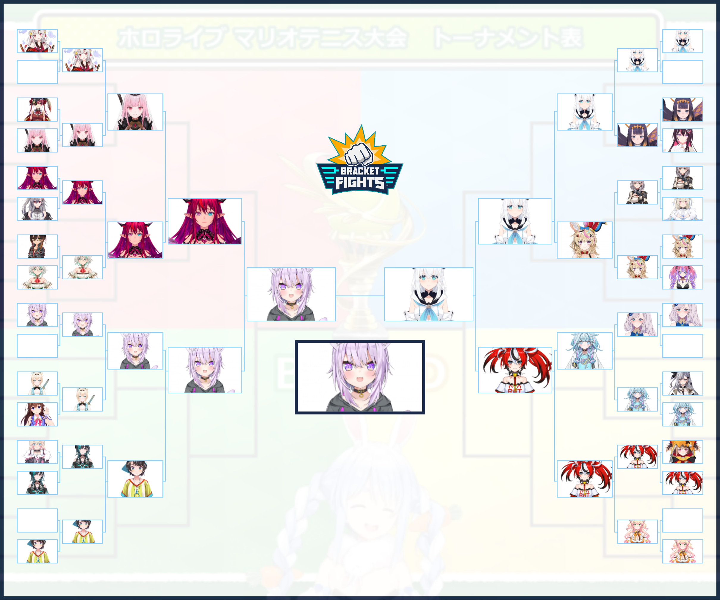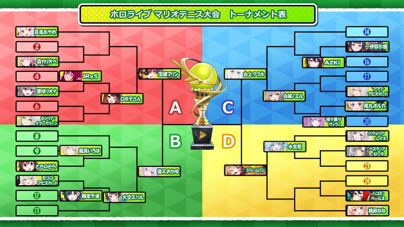 I made a bracket you can fill out here to make bets on who wins along the tournament. Fill it out March Madness style.https://bracketfights.com/bracket/youtube-and-streaming/hololive-tennis-tournament-202742/112641Just click the "Fill out this bracket Button"
