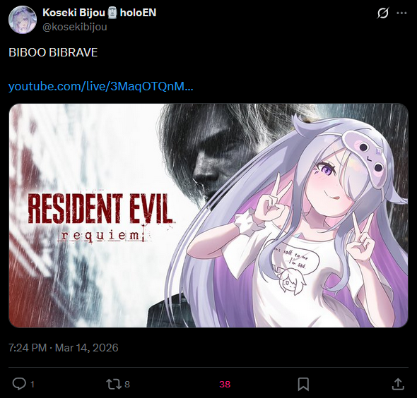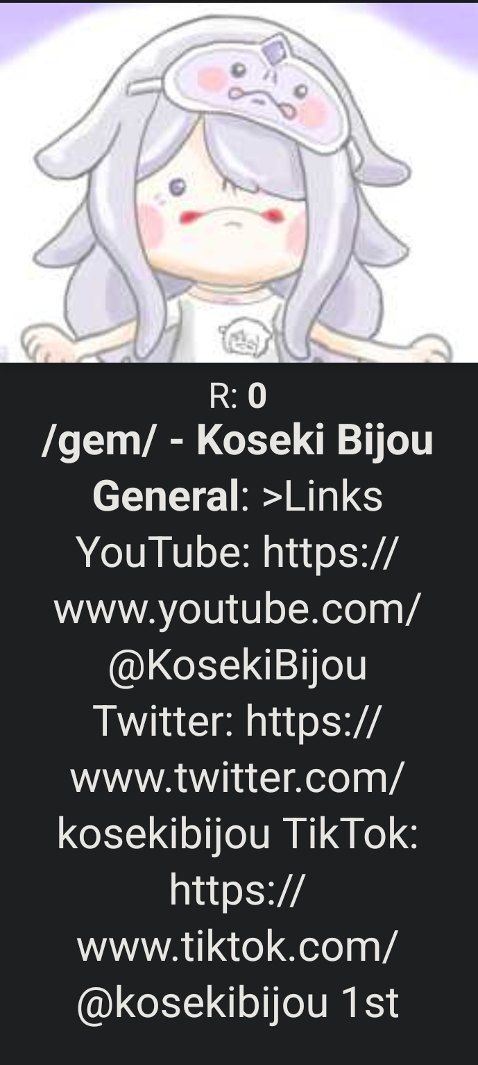 >LinksYouTube: https://www.youtube.com/@KosekiBijouTwitter: https://www.twitter.com/kosekibijouTikTok: https://www.tiktok.com/@kosekibijou1st orisong - Prism Magic: https://www.youtube.com/watch?v=M3pjFfKBonI2nd orisong - Rock In!: https://www.youtube.com/watch?v=XSZ0iMP80QQ>StreamsNext stream: Previous stream: https://www.youtube.com/watch?v=Z2q2FZ9OeGcDebut: https://www.youtube.com/watch?v=rpAQib0T5v03D Debut stream: https://www.youtube.com/watch?v=Yw0zL5YshRk>Shorts/music/unarchived streamshttps://rentry.org/e6mionzq>Merchhttps://rentry.org/tyfao78u>Intro/starter newpebble guidehttps://rentry.org/qpx5vnec>/gem/ OP template:https://rentry.org/vt_gem_opDo not engage with diggers (trolls, doxxers, holo vs holo baiters). Hide, report and rock on.>Previous>>110195796