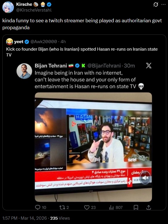 >>110240463Kek. It's really hard to beat the anti American allegations when the country America is at war with is using your streams for their own propaganda.