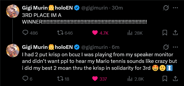>Gigi called in to Koyomama despite being a nervous rack + eepy>Gigi fought tooth and nail for 3rd placeI love my oshi, grems. Even if she has moments of self doubt and weakness, I still know in my heart that she'll try do it, even if she thinks she's shit. I was hoping for a Okayu Vs Gigi final but this is the next best thing