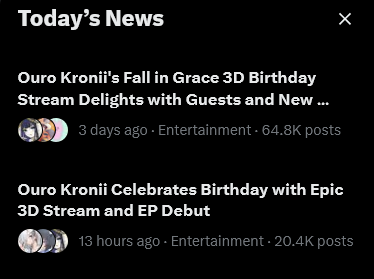 >>110238226[THE LAST TIME AN EN TALENT WON A GLOBAL GOLD, PER COMPANY]>Hololive English: March 14th, 2026 (Ouro Kronii's Birthday 3D Live)>V-Shojo: July 22nd, 2025 (Kson's FANS DESERVE TO KNOW)>Indie Scene: June 30th, 2025 (Sameko Saba's debut karaoke)>Nijisanji English: February 13th, 2024 (Elira Pendora's A Message From Nijisanji English)*Neither Phase Connect nor V4Mirai have won a Global Gold in their history.