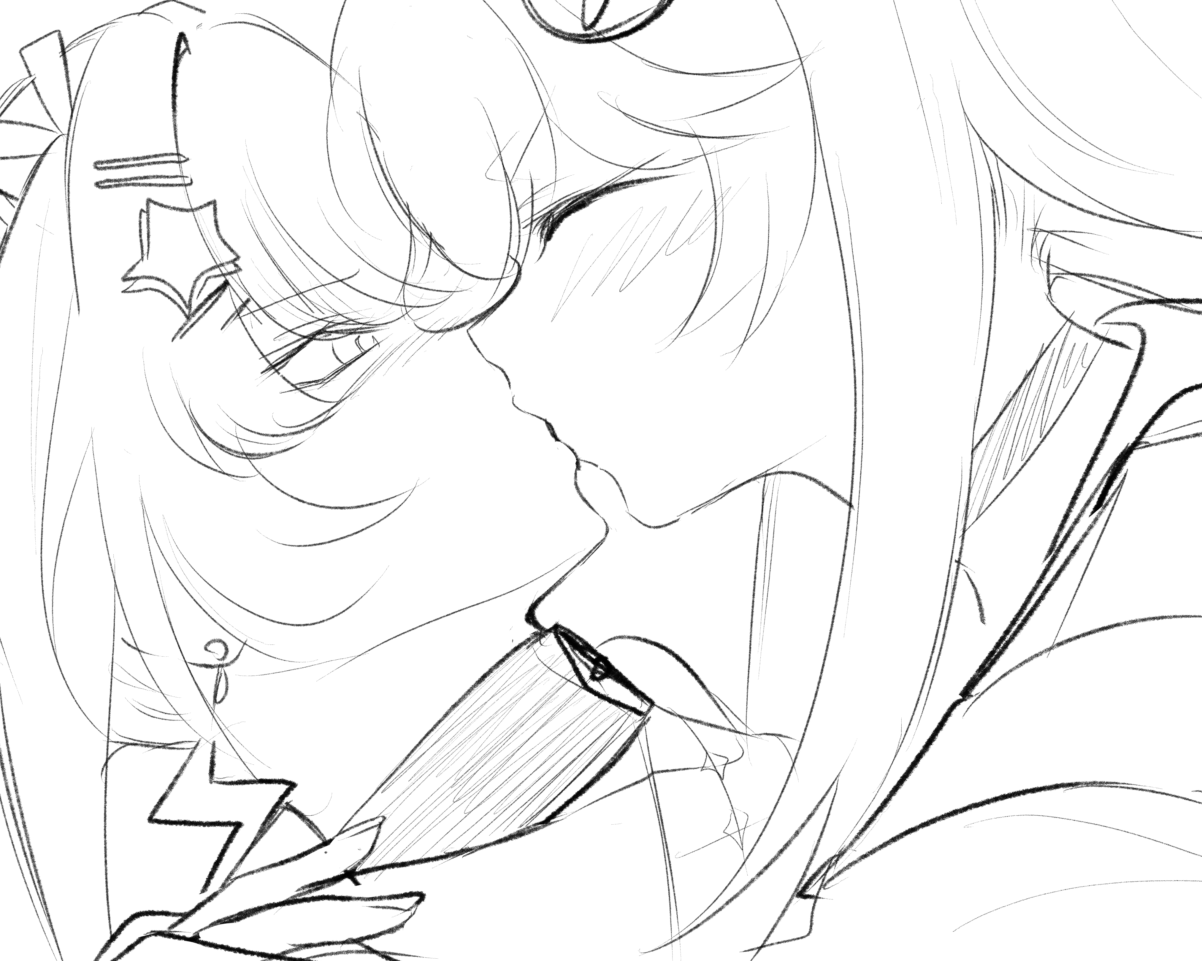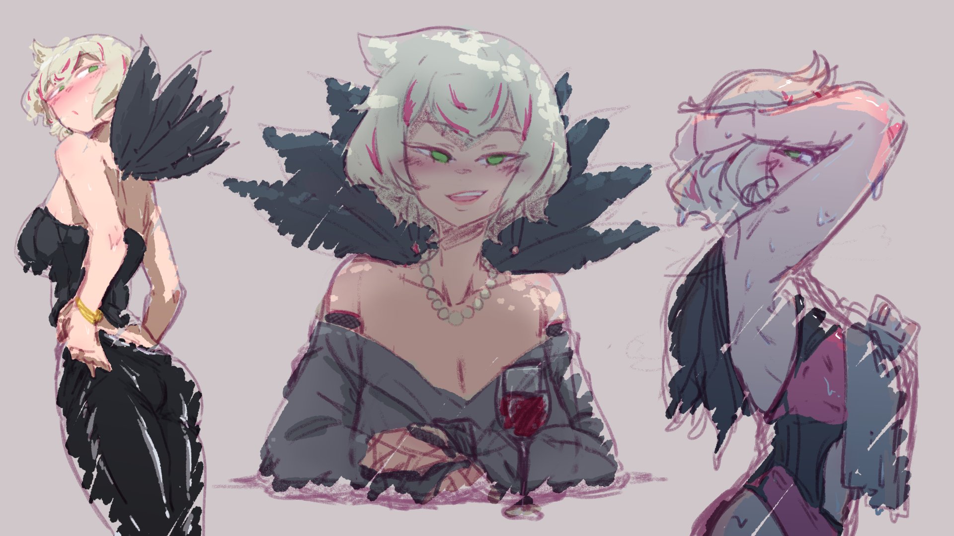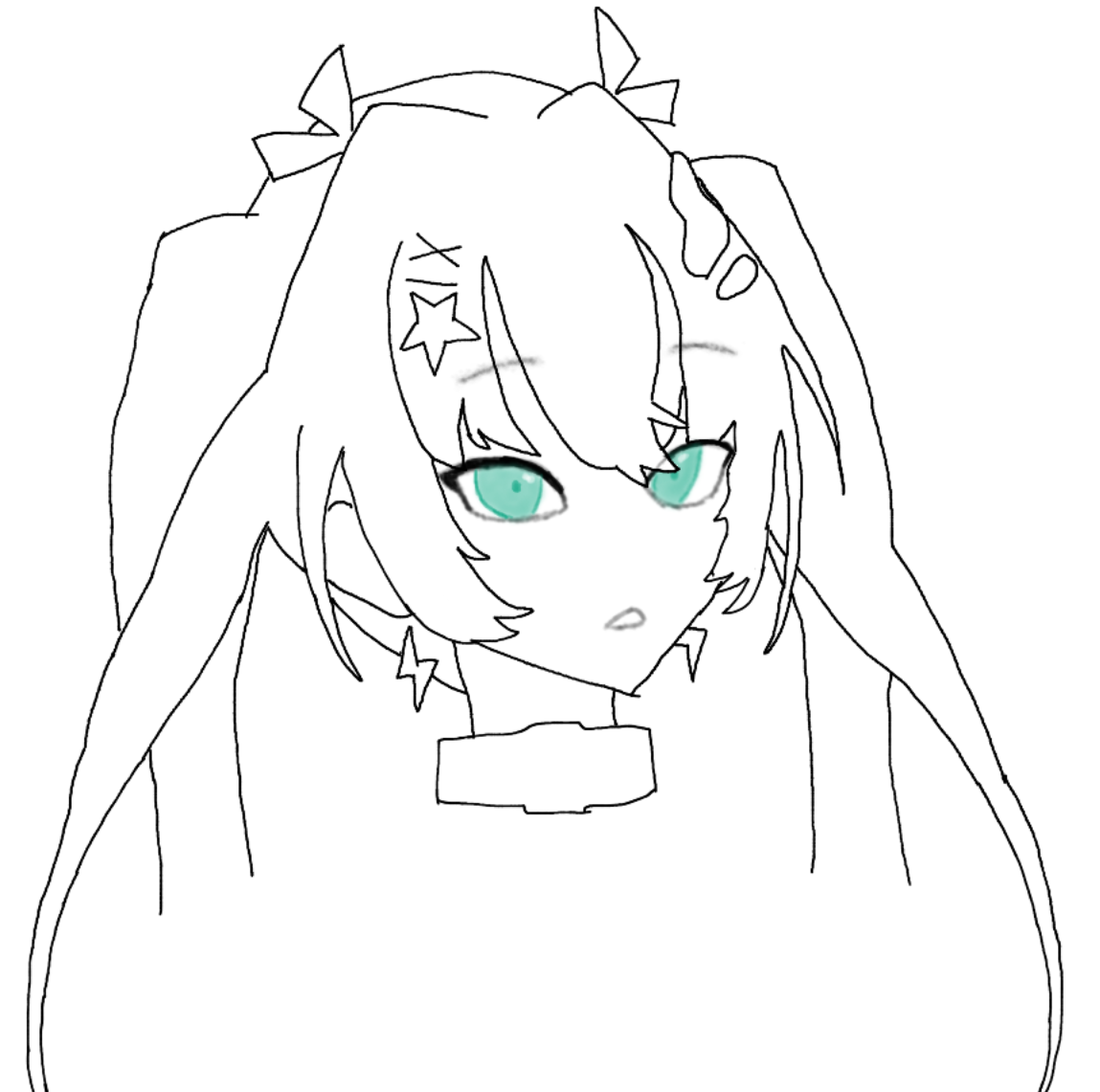 it will unfortunately have to end abruptly on the collar because the fishnet thing on Lia's chest will be the end of me and without that I might as well give up on the body the outline still needs to be polished (get it cause I'm Polish hah funny) but I just had to color in the eyes because they're my favorite part of these drawings starting to get the advice the other art anon told me, instead of recreating things 1:1 I should try to simplify them as best as I can, the hair on the left cheek looks much better than on the right