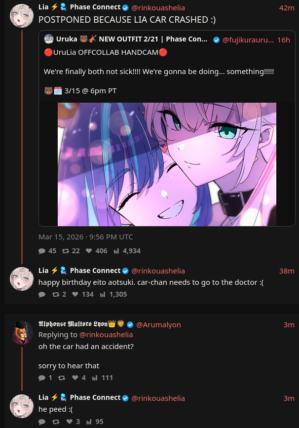 ϟ Lia Liker's Secret Clubhouse ϟ>NO GIRLS ALLOWEDChannel: https://www.youtube.com/c/RinkouAsheliaTwitter: https://twitter.com/rinkouasheliaSecret Twitter: https://x.com/wiawi_aSchedule: https://x.com/rinkouashelia/status/2031181371885105534ϟ Next time, on Lia ϟ>UruLia hand cam off collab!!!!https://www.youtube.com/watch?v=hZOLsrLMifIϟ Previously on Lia ϟ>gfe refundhttps://www.youtube.com/watch?v=bgn7oJJljWE>Girls Frontline Gooninghttps://www.youtube.com/watch?v=0QcqIMOf-xk>Final Fent XIV watchalong in the middle of the night only for the sickoshttps://www.youtube.com/watch?v=_mpyoTes3Rg>Lia is gonna get scared and threaten to pee her pants in RE9!https://www.youtube.com/watch?v=p_j1pt_bxp8ϟ Current Events ϟ>VALENTINES DAY 3D LIVE CONCERT WITH RUNIEhttps://www.youtube.com/watch?v=s4lmtMImAX8>Lia Valentine's Day merch is on sale now! Very Chinese!https://shop.phase-connect.com/collections/phase-of-the-heart-auspicious-hearts-collection>Wow! you can buy Lia's new 3d outfit!https://vlive-unite.booth.pm/items/7982255>Lia 3D live debut!https://www.youtube.com/watch?v=IRL-zrFDWocϟ Teen Idol Sensation ϟ>Lia the baby ballerina!https://www.youtube.com/watch?v=eFb9Bbpy1-I>3D debut duet with Mint!https://www.youtube.com/watch?v=xmbr-eO3Nc8>Marionette No Kokoro! [3D debut live]https://www.youtube.com/watch?v=Wuocvv0DMNA>World of Lia at the 2024 vtuber awards!https://www.youtube.com/watch?v=E2pK-g-UAWI>ANYC 2024 Teen Idol takes on New York concert!https://www.youtube.com/watch?v=3PKxPSiOmSUhttps://www.youtube.com/watch?v=bGIdCpB7uiE>Phase Origins x Mint hamtaro circlehttps://www.youtube.com/watch?v=ECALhhre7c8>Rising Higher- Lia Performance (Nikke 2.5 Year Anniversary)https://www.youtube.com/watch?v=bb4e7kYxSDA>Offkai 2025 Konton Boogie and Ashura-chan!https://www.youtube.com/watch?v=7ag9WLlnpGUhttps://www.youtube.com/watch?v=2oZKcGFJoN8>Offkai 2025 group performances! Kiraful Miracle Kirameiger & Write the Futurehttps://www.youtube.com/watch?v=EJFHGAXLIOohttps://www.youtube.com/watch?v=2_JMtDE8aAg>Valentines Day 3D Live!https://www.youtube.com/watch?v=1SAxhObRQHwhttps://www.youtube.com/watch?v=7xML6x6Z5dkϟ BUY BUY BUY ϟ>Visit the Lia shop! Plushies! Shirts! Dakis! Pins! Charms! Keychains! Oh my!https://pastebin.com/CwyAjBuc>Lia is in a real TCG!? OMG!https://oshipush.com/shop-2/>Free Lia 3D model! Yes, FREE!!!!https://ko-fi.com/s/409b01b34f>BUY THE LIA COFFEEhttps://shop.phase-connect.com/collections/coffee/products/black-coffee-ashelia-rinkou-custom-roastϟ Other useful links ϟ>New to Lia and are looking for VOD suggestions?https://rentry.org/LiaLikerVault>Free Lia desktop assistant!https://mega.nz/folder/JrtjCbhD#qZoHWqnoa8Qztf84Qlvq3Q>Cytube channel:cytuDOTbe/r/VODclubhouse (replace DOT with .)>Divegrass team:https://implyingrigged.info/wiki//lia/Remember to only love Lia, and never watch other girls. Only Lia will ever love you. ପ(๑•ᴗ•๑)ଓPrevious Thread: >>110233526