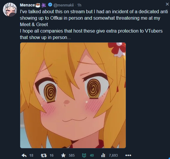 Some context info1. Menace was talking about how she saw at least three different discord servers made specifically to hate on her and spread misinformation. Clearly some of thier users are here.2. She had a schizo come to her meet and greet and waste everyone's time and when she asked him why is he even doing this he couldn't even give her an answer.Some people are just that mentally ill.