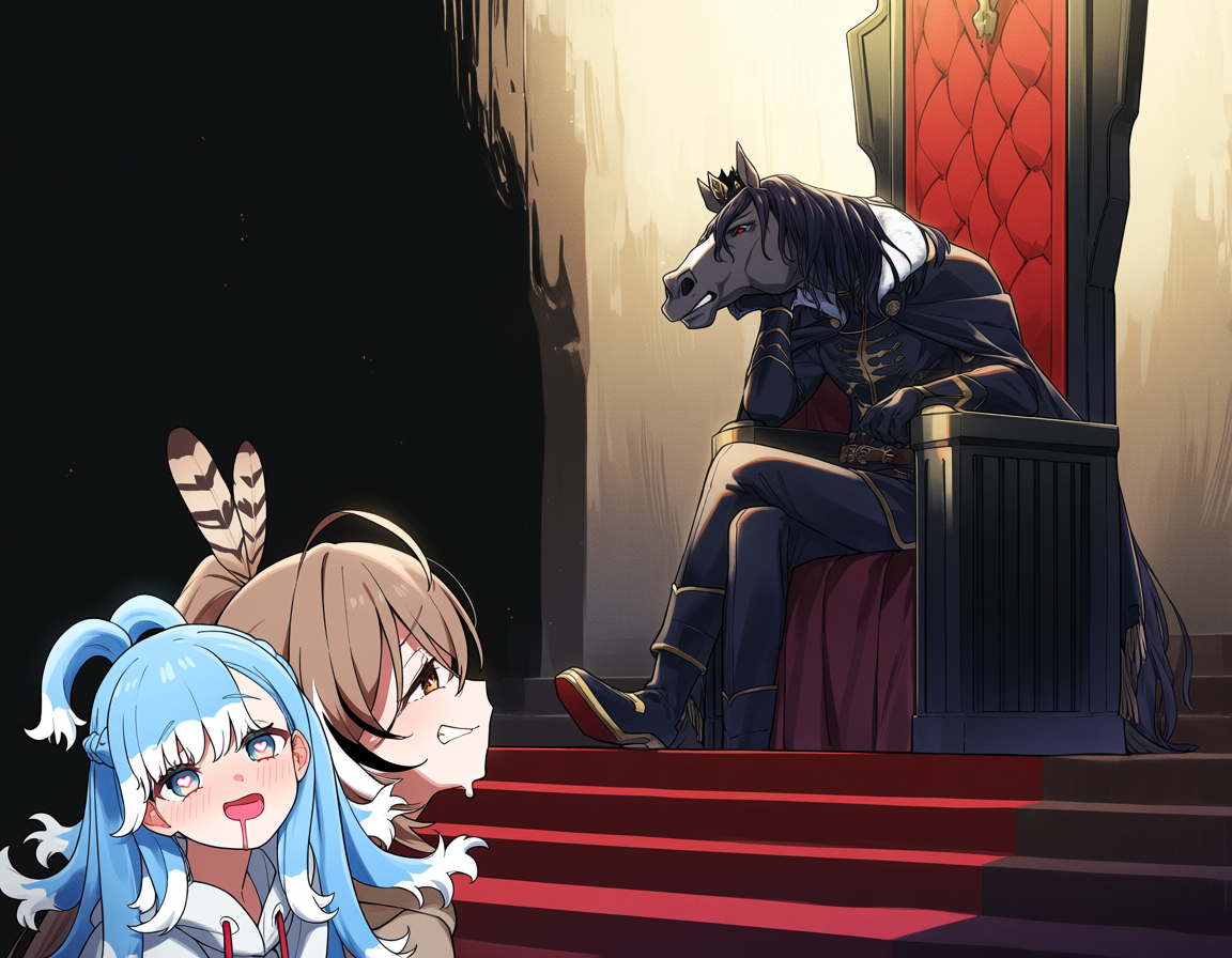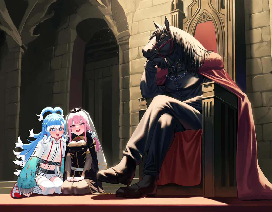 >>110265327how's about a horse sitting on the throne with mori moom kobo looking at it from below with lusty faces?