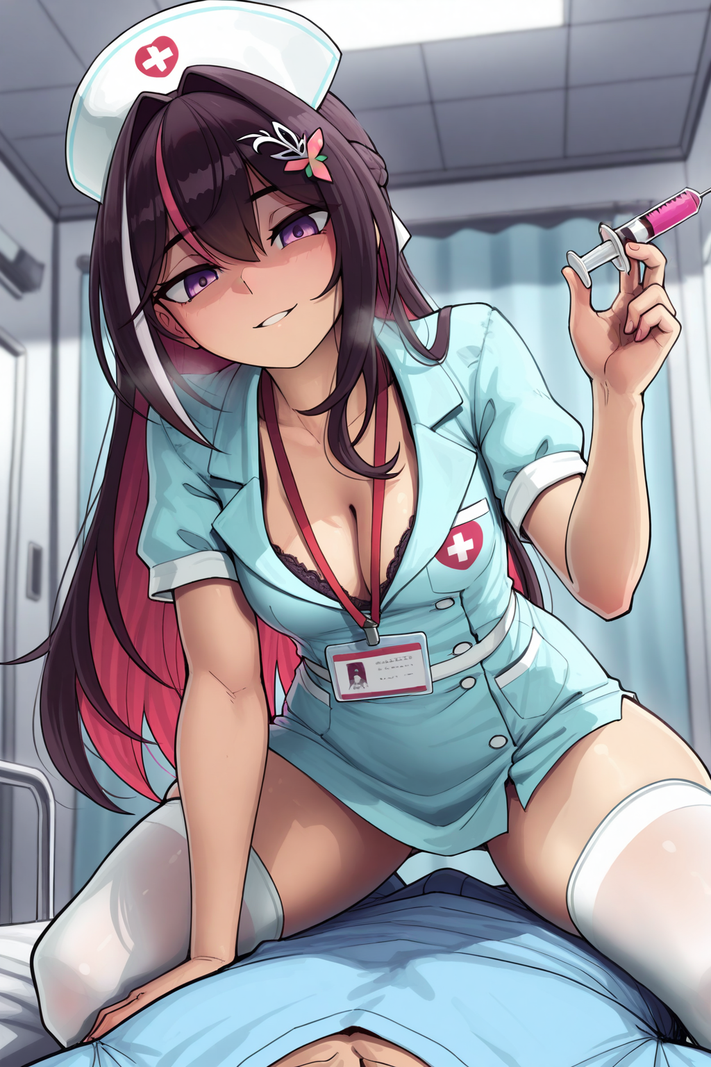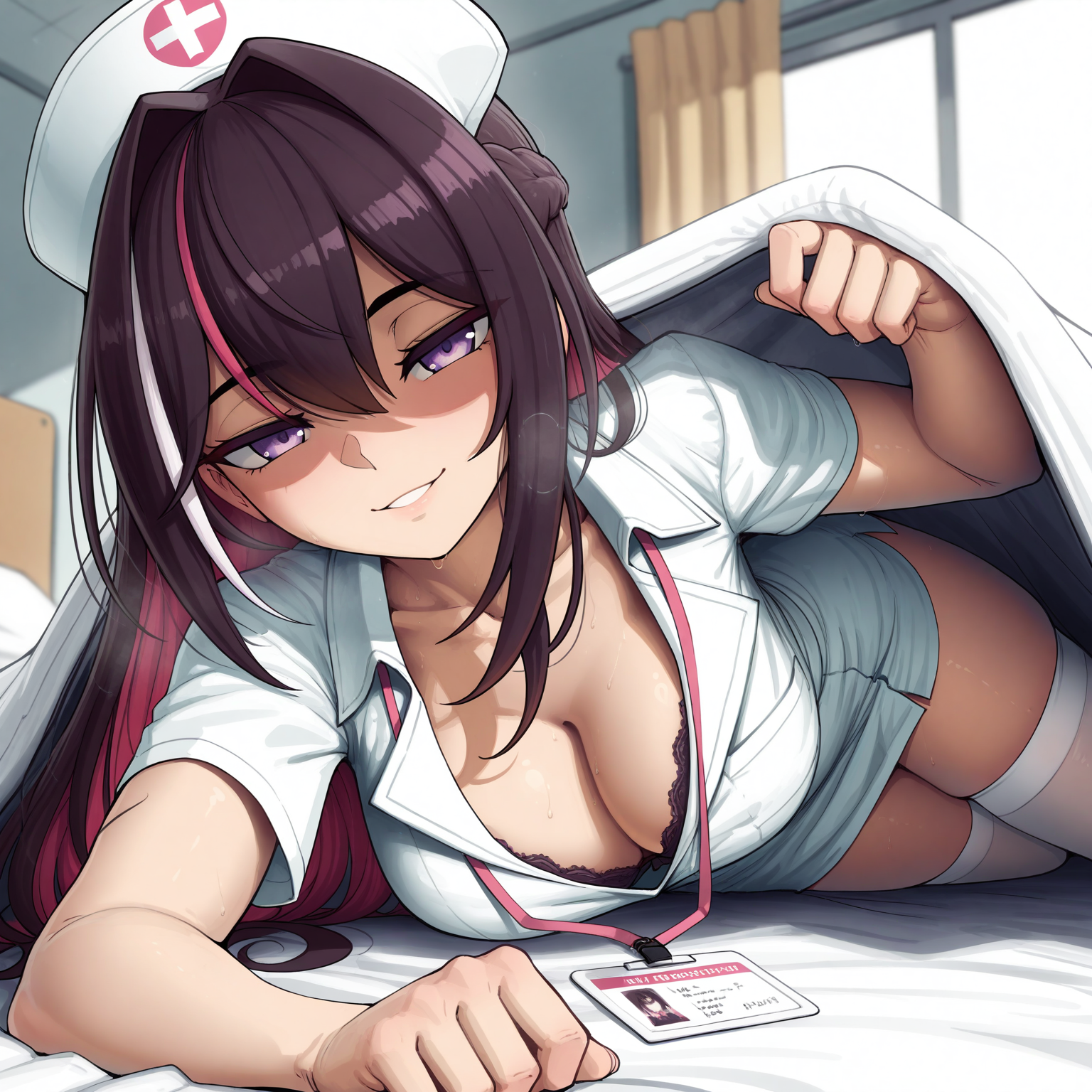 >>110279225Can you try a nurse AZKi under the blanket lifting it up cutely like peekaboo or inviting you in (without the guy) please?