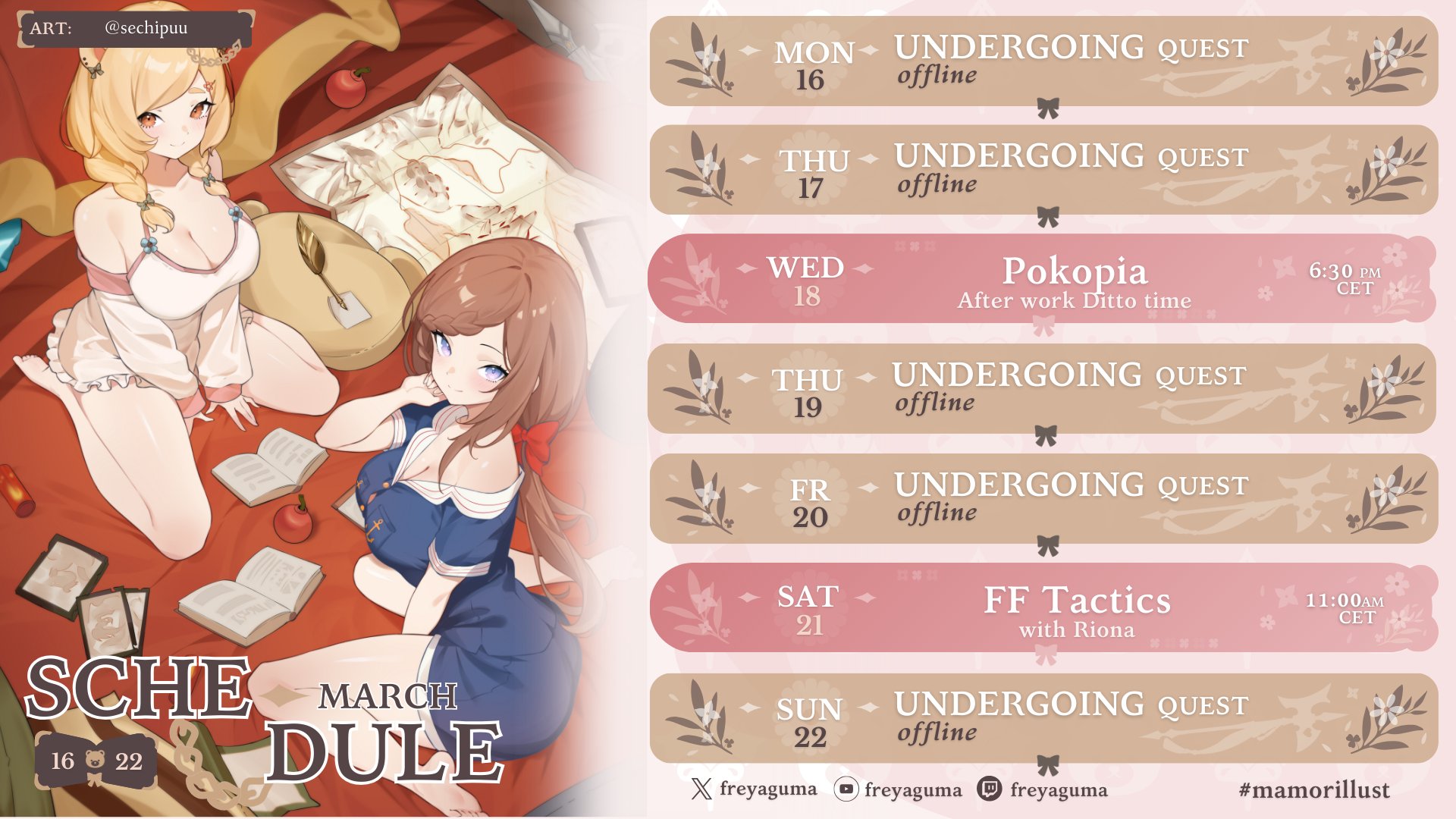 >>110272171https://x.com/agumiisdungeon/status/2028962730980315230>Btw when does she usually stream ? Or is it one of these spontenous affairs ?She usually streams um... Mid afternoon in the western timezone? She didn't seem to say a time for the debut just the date, March 21st.