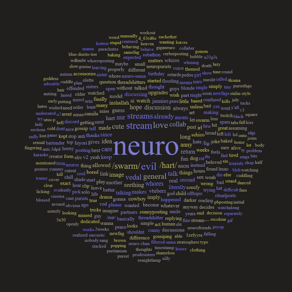 >>110285619>Comeback dev stream last year: Vedal explicitly said stop using Neuro tag for non-Neuro stuff, artists (especially Chinese) took the hint and mostly stopped doing shipping fanart>Non-Neuro shipping fanart no longer on art review.>Anny debacle: mass-casualty event for shippers>Backtuber / whore-clout-chasing wave: peaked, then died when they got called out and Vedal gave zero fucks>Whore clipping scene: collapsed because Vedal barely collabs anymore and gives no fuel>3rd Subathon: almost no shipping bait unlike the 2nd subathon>The few shipping fanarts now is almost exclusively commissioned porn rather than organic pieces made because the artist actually wants it or because the ship is popular>Swarm sentiment shift: went from tolerating/encouraging Vedal shipping to actively distancing from it. The vibe flipped from "Vedal is besties with all the collab partners" to "Vedal is a cold, business-first guy who isn't really friends with any of them". The "moms and aunts" shit died too.TLDR: Vedal himself drew a line, the Anny arc nuked morale, the backtuber wave collapsed, the subathon gave zero new fuel, the Swarm culturally rejected it, and the last whore collabs made zero splash.PS: Neuro won.