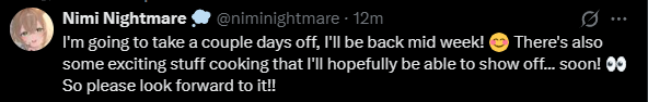 >a break againWhat is nimi's problem