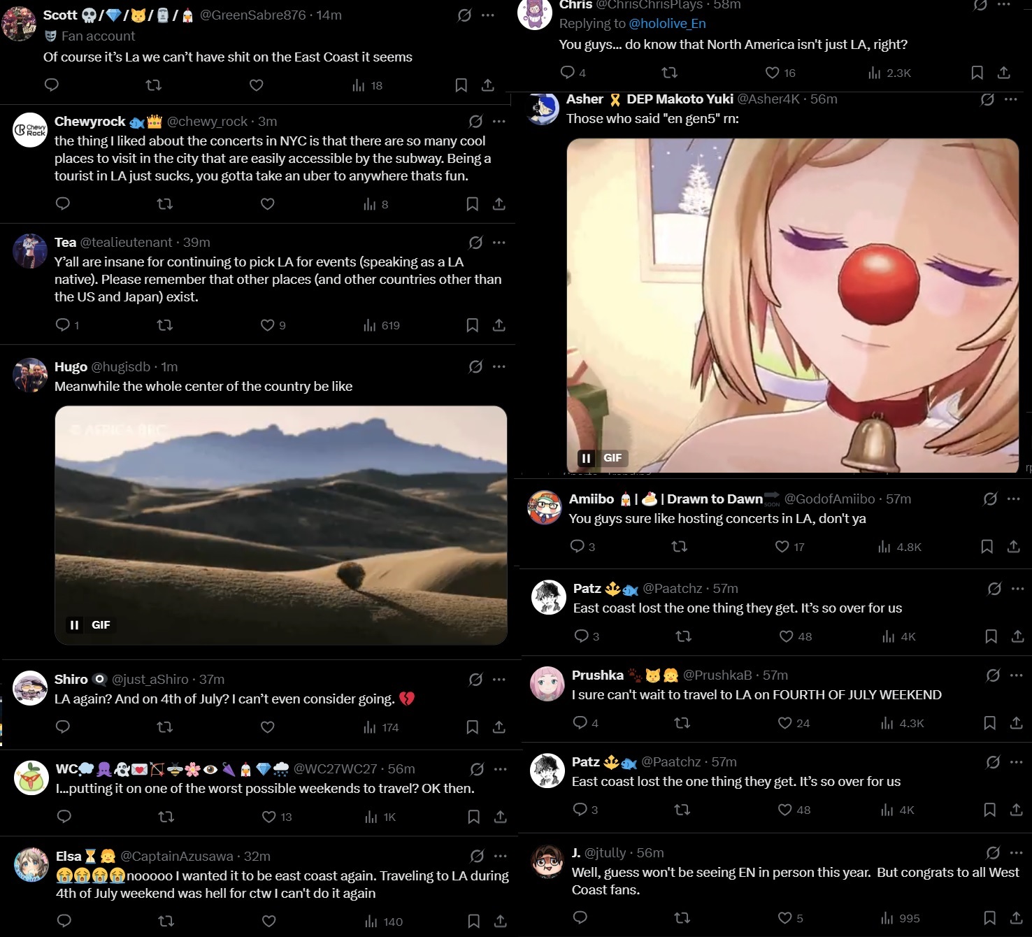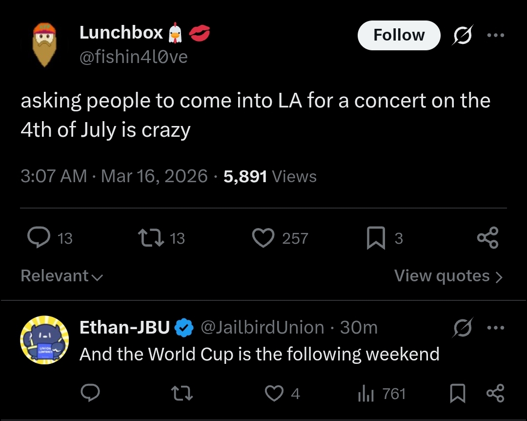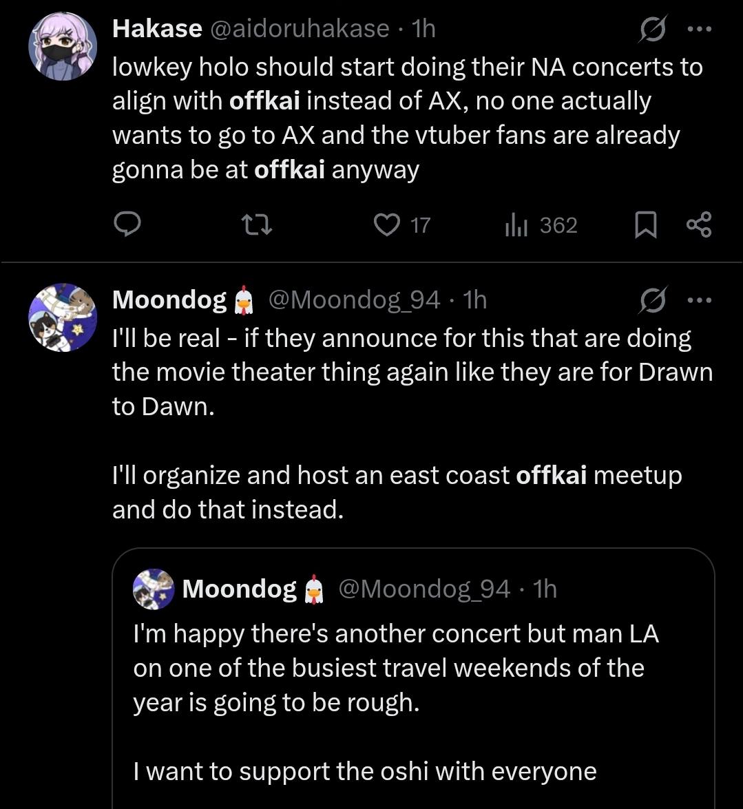 >>110282400>>110282514YeahOffkai and AX2026 / EN concert are around 17-20 days apart. Unless you live in LA or Cali or is unemployed, most people are likely not going to take breaks and travel twice in a month for their hobby (if they happen close enough to each other you can merge both trips)