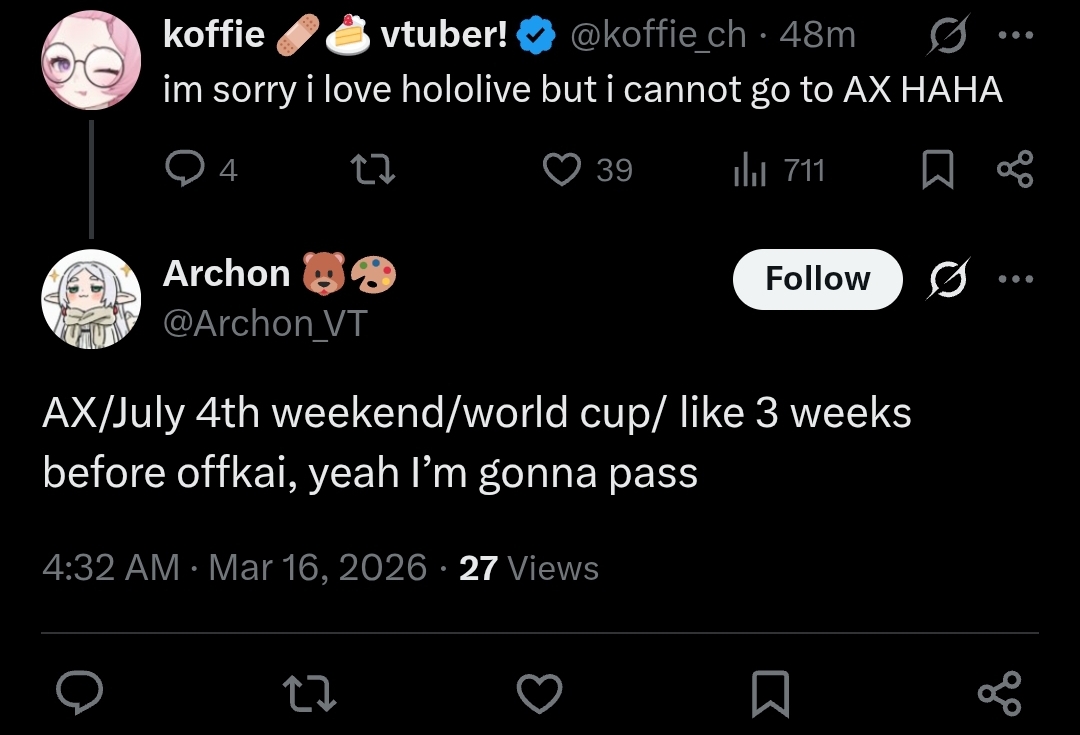 >>110282518>no one actually wants to go to AX and the vtuber fans are already gonna be at offkaiI've never heard a better endorsement for AX