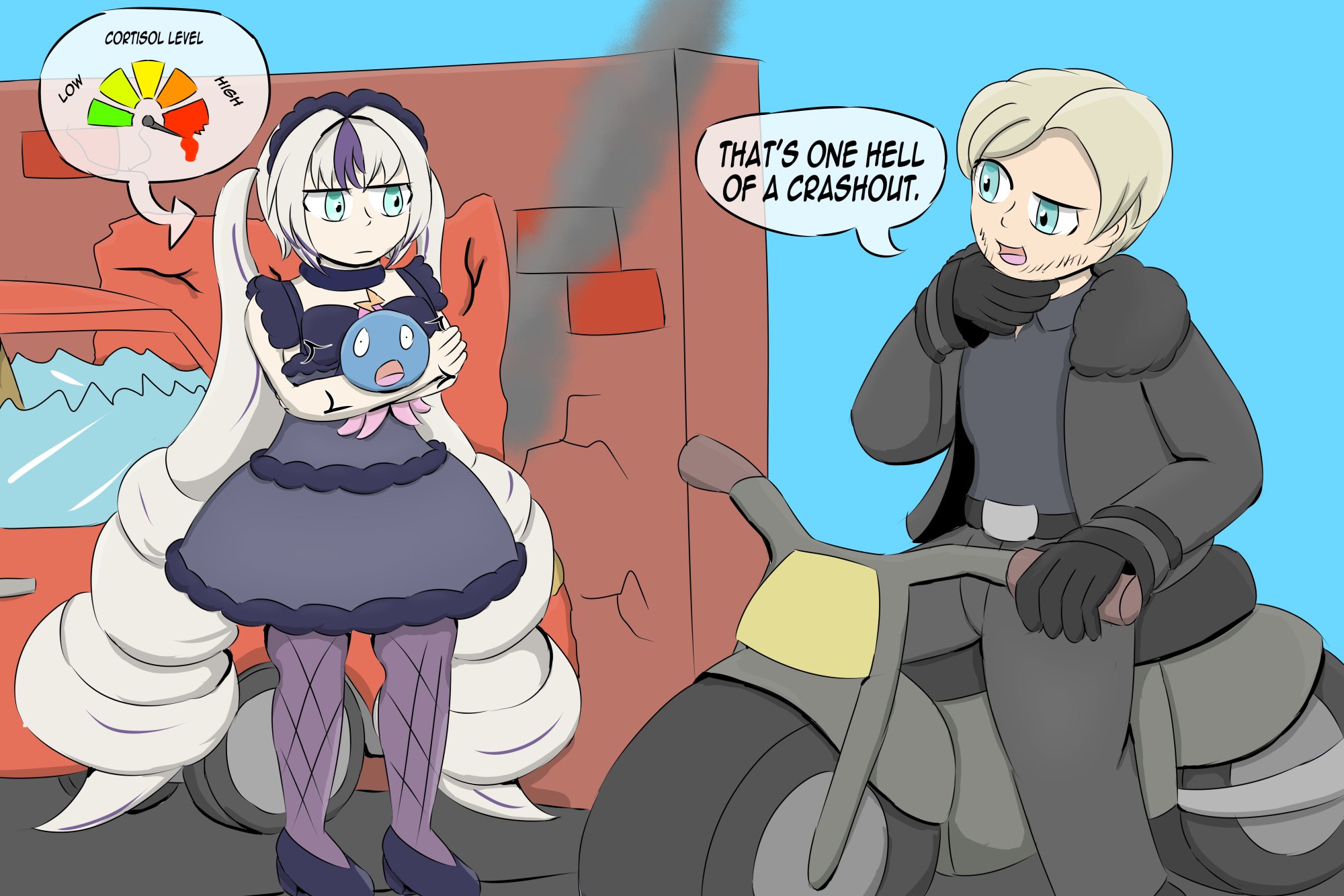 Runie as a tall buff firefighter saving Lia from a car crash (minor fender bender)