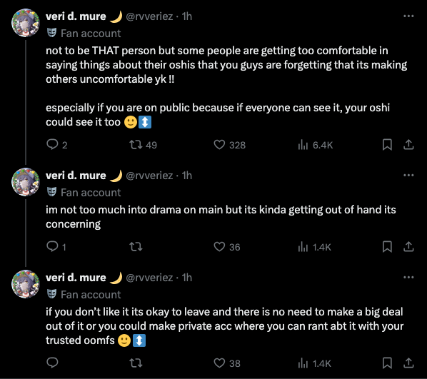 not to be THAT person but some people are getting too comfortable in saying things about their oshis that you guys are forgetting that its making others uncomfortable yk !! especially if you are on public because if everyone can see it, your oshi could see it too