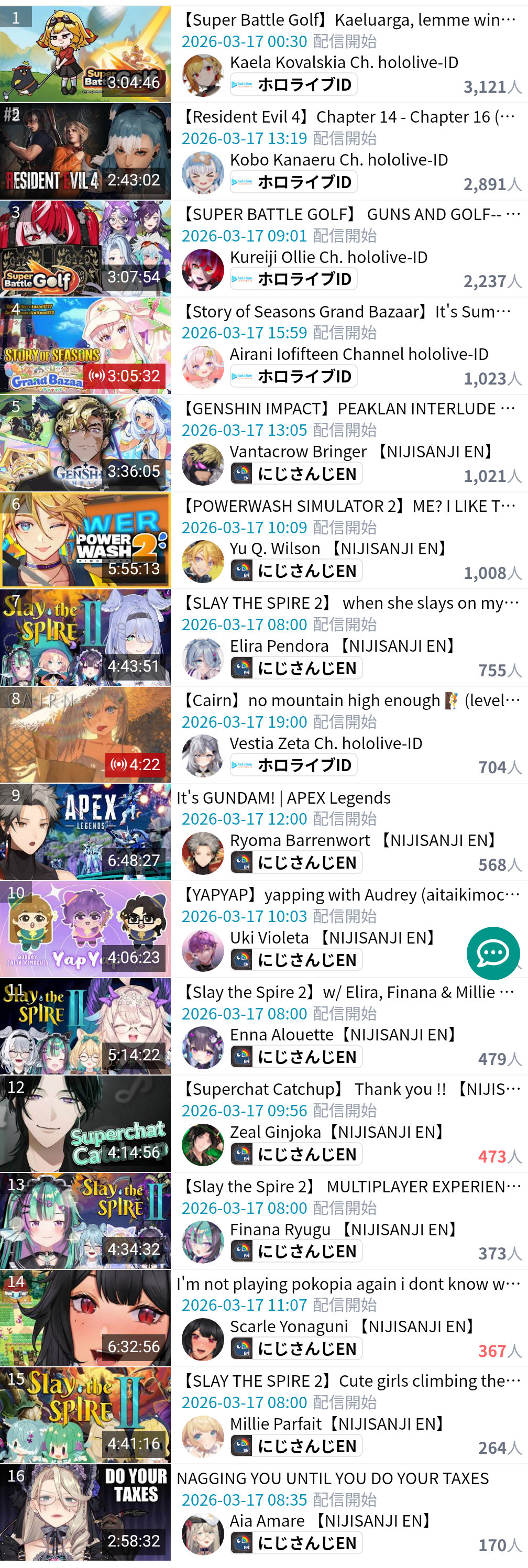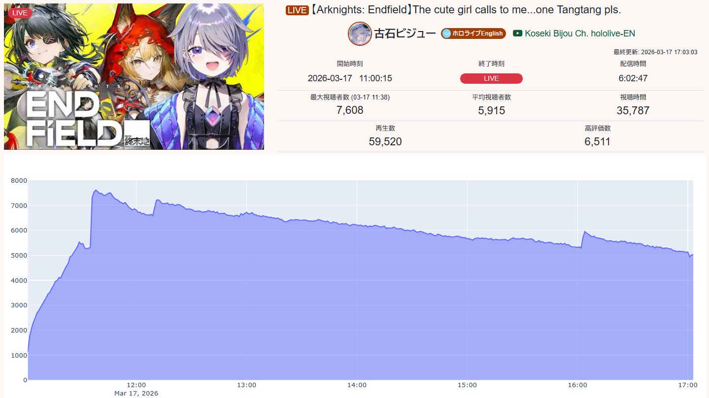>>110315461I didn't want to bring that up since people might've thought that I was shitposting, but Migo's numbers since 8th of March have been dropping compared to her usual numbers over the last 6 months. More than half of her streams (all the way back to Oct '25, I didn't bother checking further) peaked above 30K and yet since 8th March, she had 0 stream peaked above 30K out of 12 streams.Either Migo's numbers dropped due to whatever reasons you think there might be, or Pokemon is somehow just a debuff game to 35p (11 out of her 12 streams were Pokemon Red or this Pokemon game)She still gets 20K+ streams most of the time, but it kinda pales in comparison to her performance in later half of 2025
