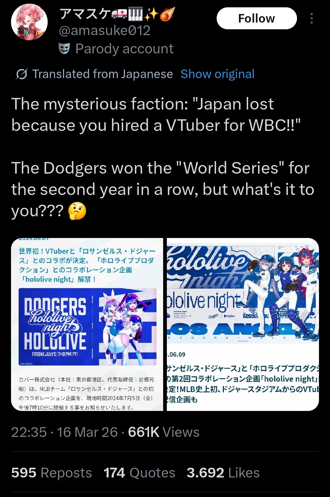 >>110315405>Are the Japs retarded? That's so stupidAnon, while it's fortunately reversed, a decent amount of Dodgers fans (including non-VTuber fans) do think that Hololive bring luck. Sport fans can be surprisingly superstitious.