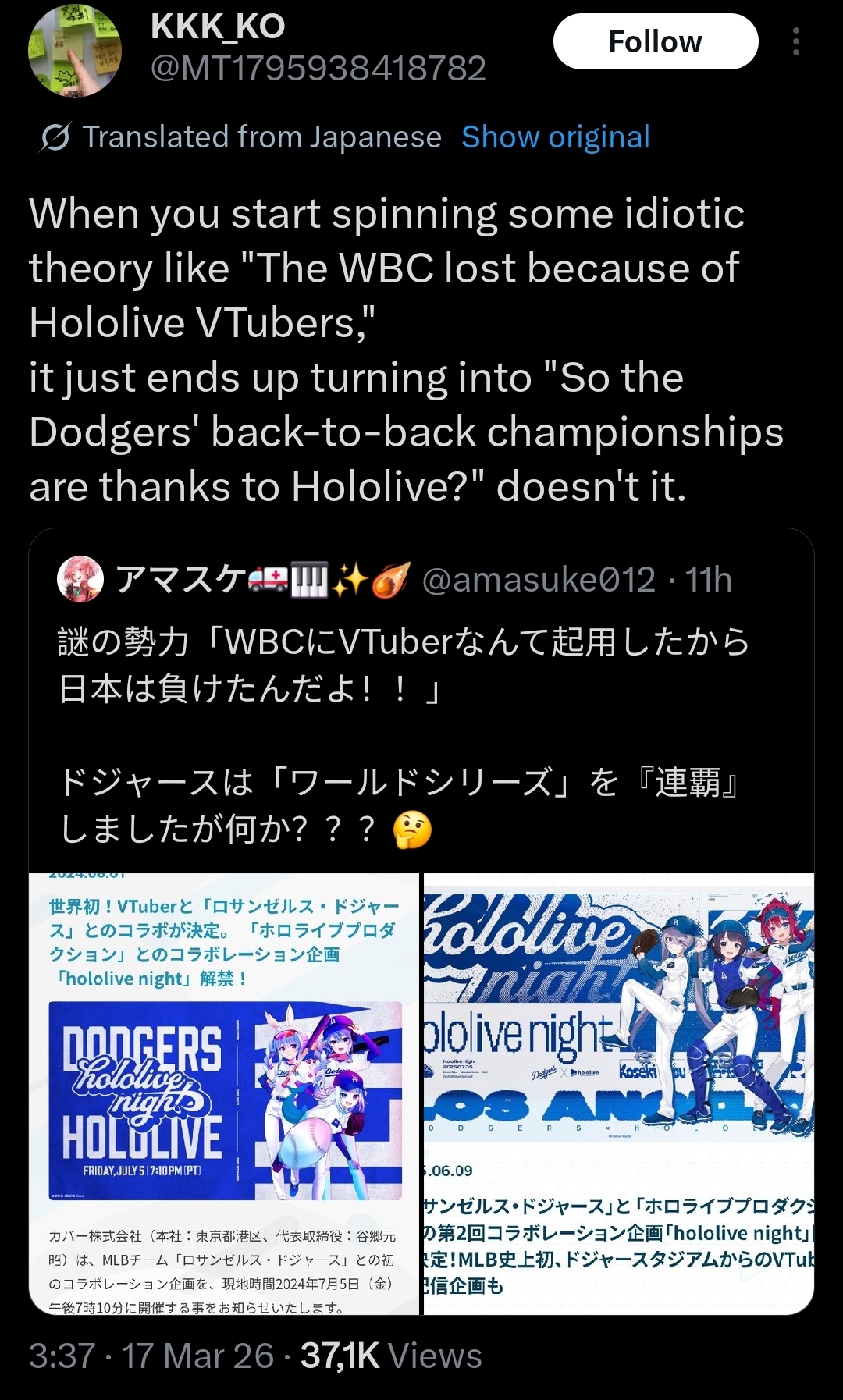 >>110315187dogpile on twitter for the nth time, this time is a combo of baseball autists mad about the wbc and vtuber antis spearheaded by a "comedian"
