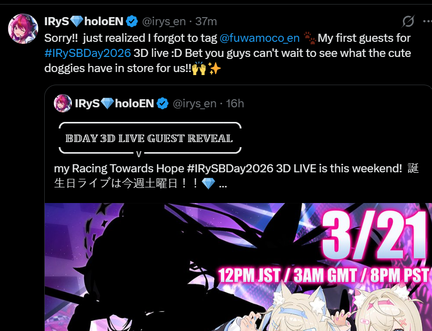 >>110311795It really shouldn't be IRyS because she streamed during the day on the 14th JST and then had PT at night.