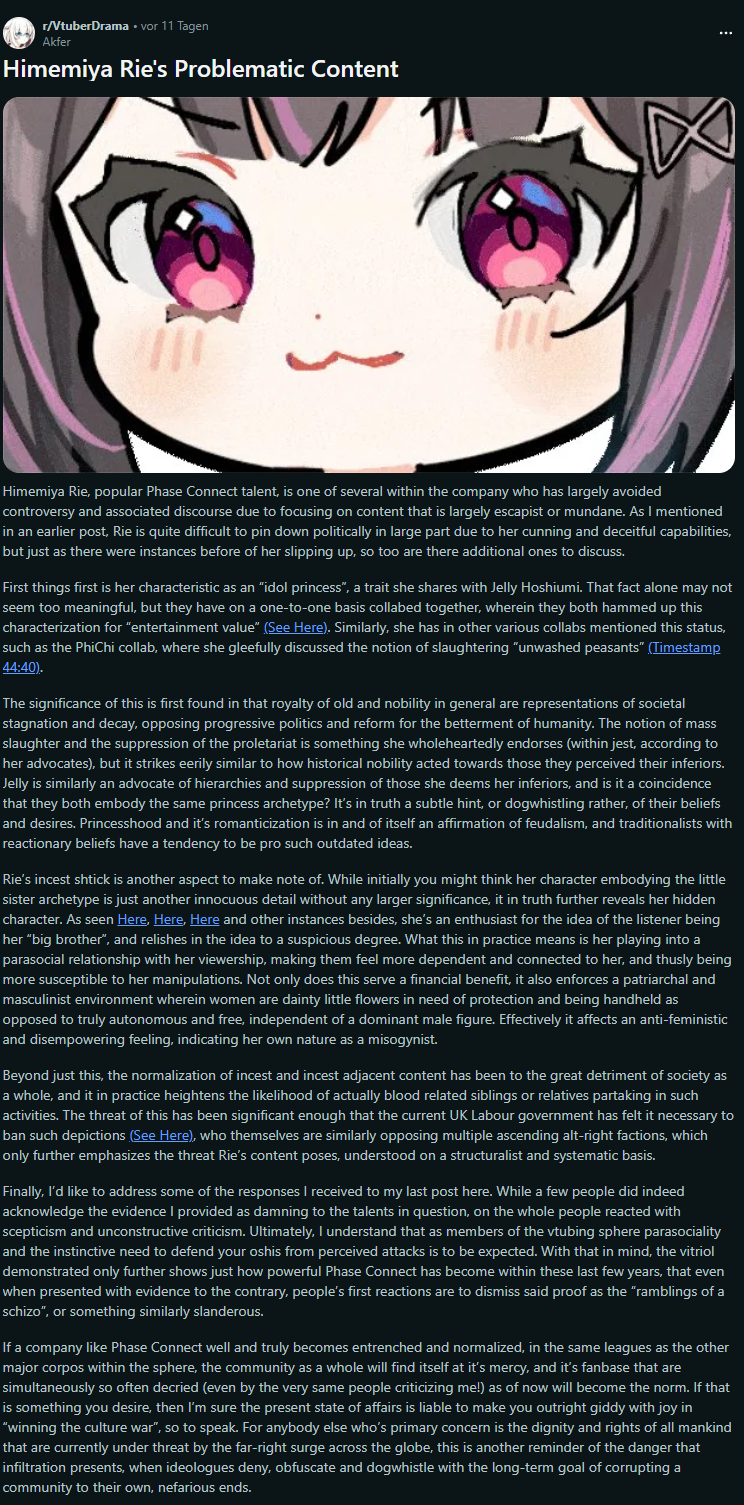 >>110313378I ain't reading all that shit. Do it yourself.https://www.reddit.com/r/VtuberDrama/comments/1rm7vng/himemiya_ries_problematic_content/