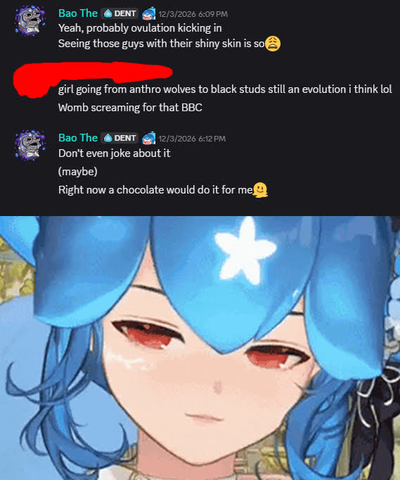One time I was in a chat with Fang and she noticed my art of my fat chud bitch wife Denpafish and it's weird that she singled that out and I still wonder what she meant by that. I think she knew I was the Denposter but couldn't say it. You should set up a collab with Fang, Denpa! You're both super autistic Denpa!