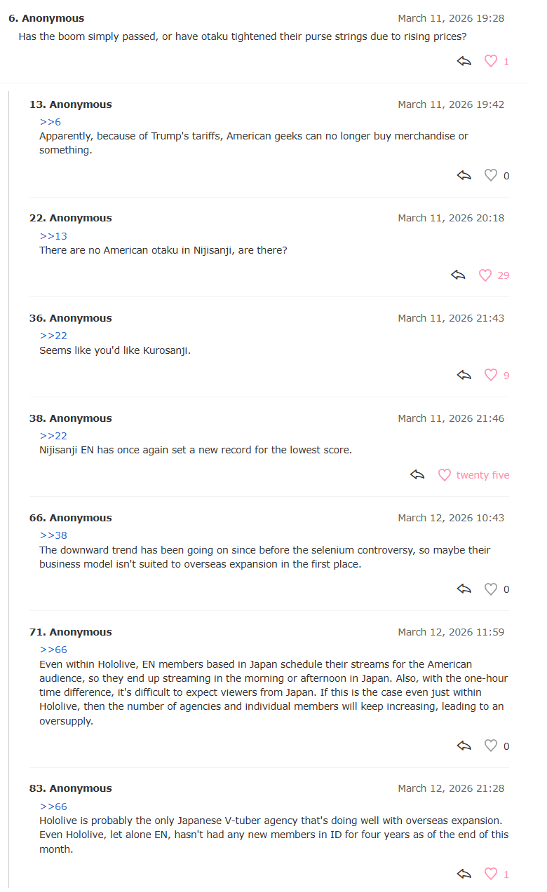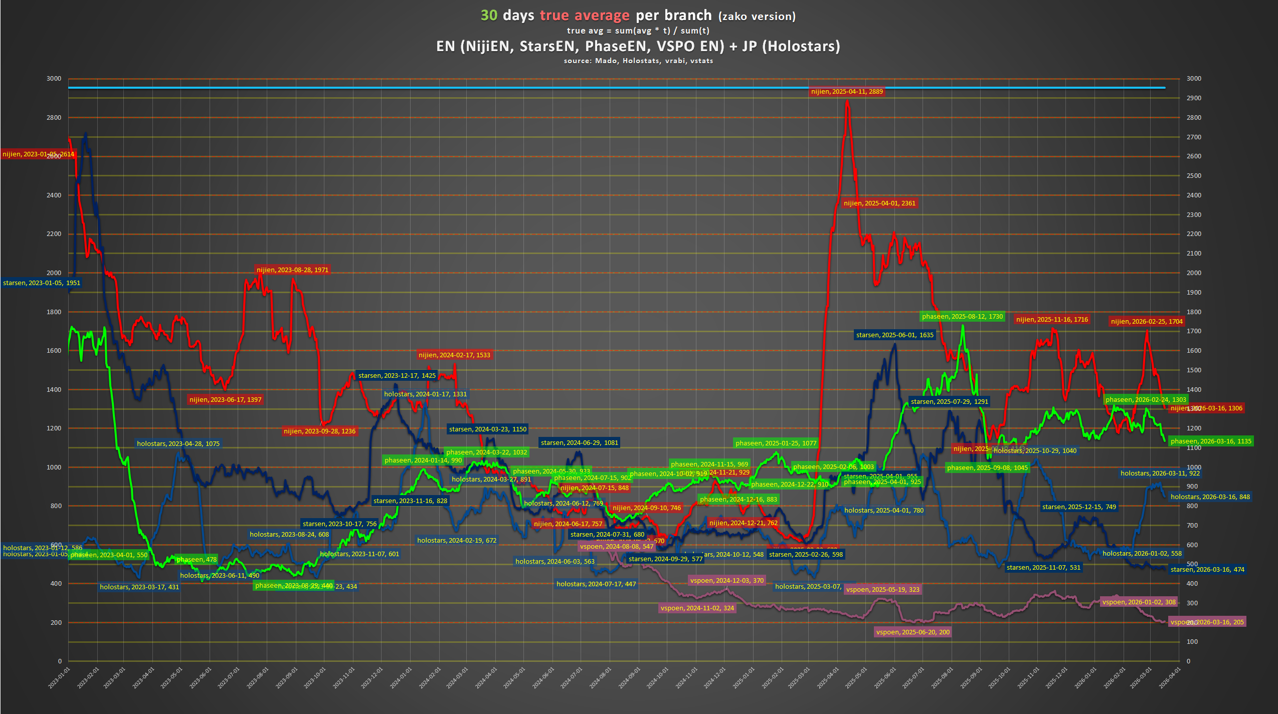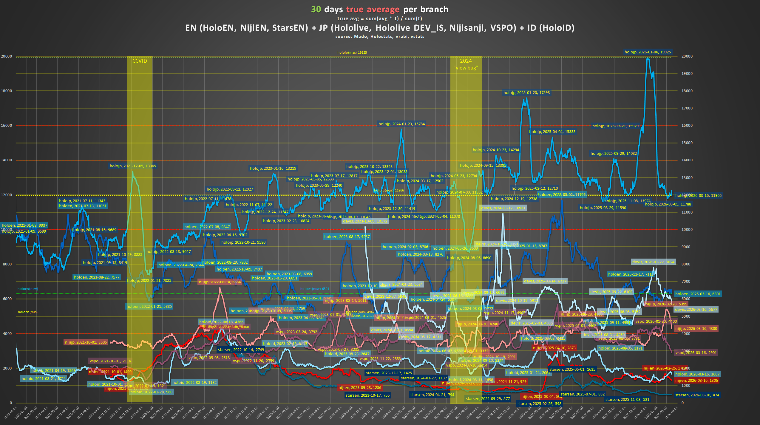 Heh, for those who missed last thread, here is an update on that>30 DAYS TRUE AVERAGE, PER BRANCHchart.Some usual comments>1) Hololive (the Japanese branch)After a CRAZY end of year programming with their all time high they're back at their "support line" of 12k, still impossibly high but, for them, a modest place to be historically>2) HoloENSeemingly unaffected by the start of the year slowdown, they're strongly ahead of the 6k line>3) Hololive DEV_ISLike their main branch counterparts, strongly slowed down from their end of year heights>4) Nijisanji (the Japanese branch)A steep incline due to their GTA participation (compensating for the lack of end of year buff) followed by a corresponding steep recline right after the last day of the event, in the direction of the 4k line>5) VSPOAfter a strong end of year and even stronger January, they embarked in a deep dive towards to the 3k line. (Any explanation for that?)>6) HoloIDLike HoloEN, countering the general trend and experiencing a slight incline in the first trimestre, back at chasing the 2k line>7) NijiENLike their main branch (and coincidentally at the same time), experiencing a recline starting at the end of February>8) StarsENAfter what looked like could have been a comeback mid 2025 they're in a death spiral of suck and bad numbers, slowly gliding to the depths of the sub 500 line in their all time low mark of 474