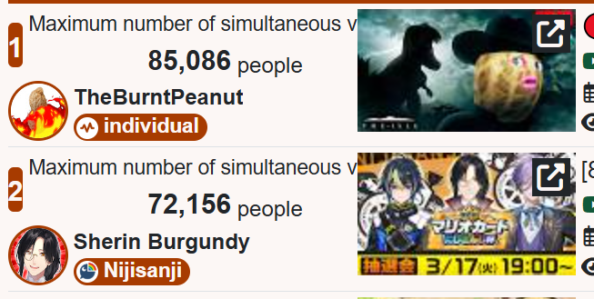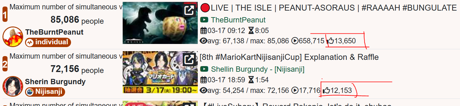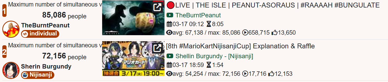 >>110316041VSPO EN is just sad, man. They had the opportunity to hang around 1k but decided to be friendly with NijiEN and it tanked their numbers massively.