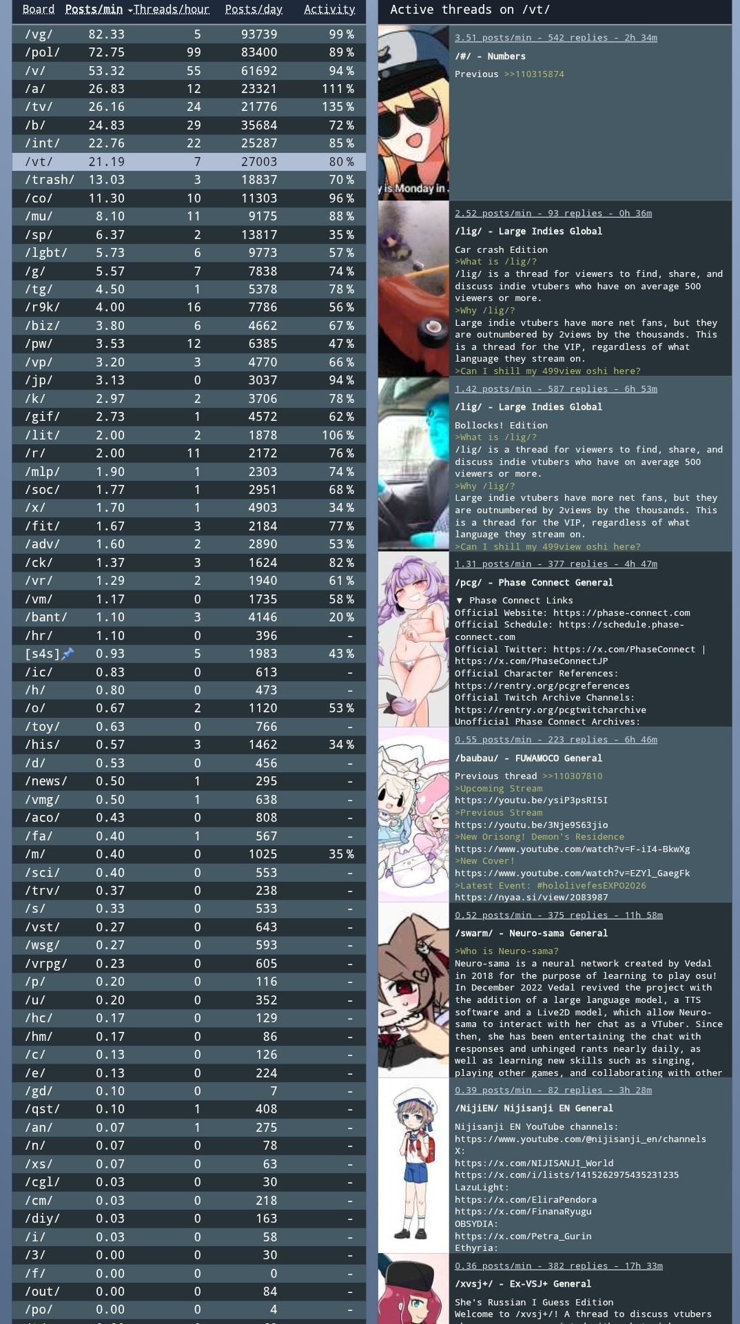 *GENERAL NUMBERFAG SITES*>https://playboard.co/en/>http://ikioi-ranking.com/>https://vrabi.net/>https://vtubertracker.info/en>https://live-ranking.userlocal.jp/vtuber-rankingHololive sites>https://www.hololyzer.net/youtube/index.html>https://trackholo.live/en/>https://holo-spotify-stats.jirikunes.eu/>https://holo-tracker.vercel.app/Twitch>https://sullygnome.com/>https://twitchtracker.com/>https://stats.roki.sh/>https://streamscharts.com/