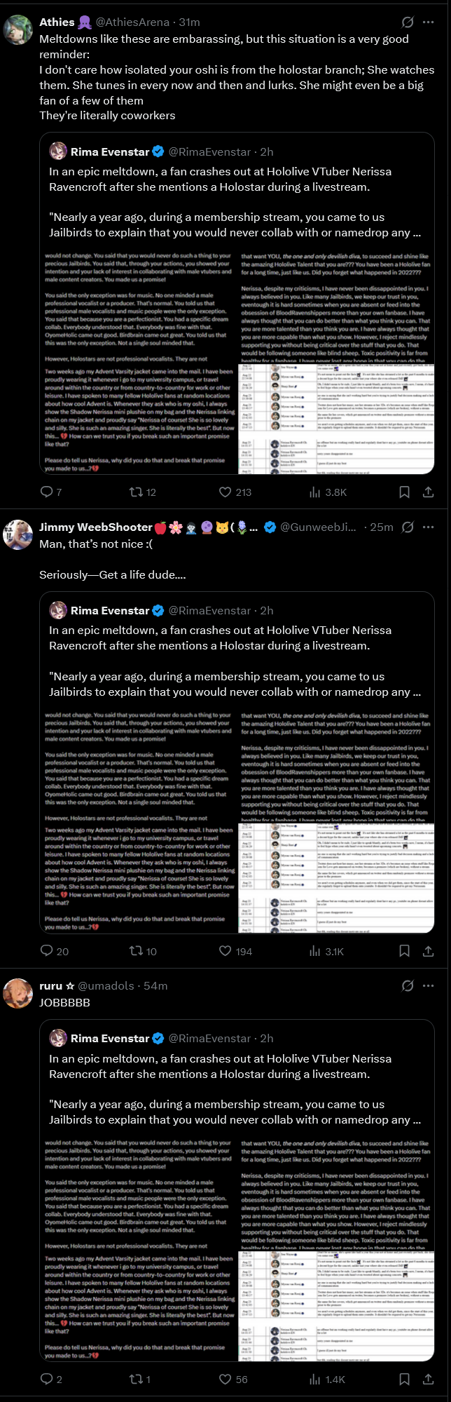 >>110323299Nerissa is more obssessed with twittertroon-approval than anyone else in EN by a mile. The chances that she actually just ignores this drama are kinda low. Plus she's already taken the side of freakshows that don't watch her, against her own schizo jailbirds, several times.