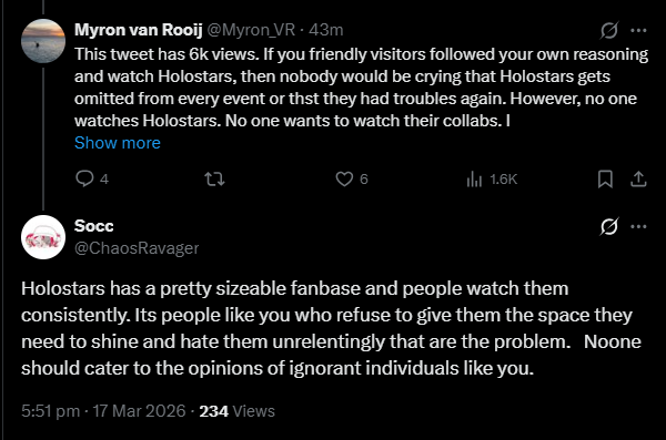 >>110321860>who was the unit leader for myth?The gen leaders are the first to debut and Japanese corporations are obsessed with hierarchy. This anon listed them for Myth, Council, Advent, and Justice. >>110321946>>110322643It doesn't help their cause when they say they don't watch Hololive and "I won't spend a dollar on this but I want it to change" is a baffling mentality.